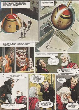 remarques: | à nouveau deux épisodes a) les pirates d'Elekton la ville de Trigan est devenue Trigopolis, des pirates au masque de fer attaquent le transatlantique "princesse de Vorg" puis nouvel attentat sur la banque nationale de Trigopolis, Janno est neutralisé en menant une enquête reprise par Trigan qui découvre que le chef des pirates nommé le cerveau est Zapho un ami d'enfance de Trigo qui veut se venger de lui, mais Trigo et Keren (le fils du roi des Davoli qui est devenu le compagnon de Janno) réussissent à s'infiltrer chez les pirates et à les neutraliser b) l'anneau de Zerss où est enfermé le monstre le plus cruel d'Elekton >> p. 28 le monstre grâce à son complice Mepho qui use de chantage sur Peric (le savant de Trigopoli), le monstre réussit à s'évader et des catastrophes s'abattent sur Elekton, conscient de sa faute, Péric révèle à Trigo le point faible du monstre: la graine d'ambition Trigo défie alors le monstre dans un duel régulier et celui-ci sauvera même la vie de Trigo durant le duel en se faisant mordre à sa place par un serpent venimeux, le monstre en meurt mais se réconcilie avec Trigo facit: dans l'homme le plus cruel, il y a toujours quelque chose de bon >> deux épisodes assez intéressants surtout de par le graphisme |