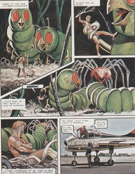 remarques: | trois épisodes pour cet album a) la révolte des Tharviens un chaos dans l'empire trigien est causé par des boites noires (réalisatrices de rêves fous) fixées sur le corps humain et qui transportent la personne concernée au septième ciel (un genre de paradis causé par la drogue) >> p. 10 les curieux parachutes de l'aviation trigienne Janno avec l'aide de Péric trouvera la parade n.b. Roffa est déjà mentionné b) les forces mystérieuses d'Elekton par lesquelles Trigo est miniaturisé lors d'une explosion nucléaire et projeté dans un monde microscopique, Janno ira le récupérer et tous deux reviendront au monde normal grâce à l'action du mage d'Orcadie, un monde minuscule au bout de la chaîne de miniaturisation >> p. 15 et 28 un Trigo miniaturisé qui doit combattre une souris et des bactéries c) l'entité de la lune Tarron une menace inconnue (la force maléfique) provenant de la lune Tarron est retournée à son expéditeur grâce au sacrifice de Zacco qui avait ramené cette menace lors d'un voyage à Tarron, Trigo érigera une statue à la gloire de Zacco >> un album où Janno se distingue à nouveau pour la grandeur de l'empire trigien, mais texte et graphisme ne sont pas de grandeur particulière |