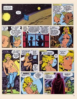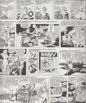 remarques: | édition du Fromage, adresse: 17, rue d'Odessa, 65 pages, N&B les aventures érotiques, sulfureuses et comiques de la pulpeuse (aux seins et fesses bien arrondies) Sally Forth n.b. sally forth = jeu de mots signifiant passer à l'offensive, se mettre en route pour l'aventure, sally = 1/ sudden breaking out by soldiers who are surrounded by the enemy 2/ good-humoured attack on somebody; forth = forwards initialement les aventures de Sally Forth furent publiées dans "military news" en 1968 pour entretenir le moral des troupes américaines Sally est accompagnée de ses amis-soldats, les durs de durs: Q.P. Dahl (le bébé-soldat), Kicky McCann (l'expert en art martial), Wild Bill Yonder (le pilote), Hairy James (le gorille spécialiste en explosifs) et Snorky, un résident martien doté de pouvoirs spéciaux rencontré sur Mars par Sally Forth >> p. 3 les formes alléchantes de Sally (surtout sa poitrine) comme appâts pour attirer l'ennemi dans un piège leur ennemi juré: le capitaine de sous-marin allemand Meno et son poumon d'acier, son crochet et sa jambe de bois après une période d'entraînement, Sally a été envoyée par fusée sur Mars où elle fait la connaissance des martiens, notamment de Snorky, et de leur robot omnivore qui engloutit les déchets (un engin contre la pollution) >> p. 6 Snorky le martien >> p. 15 la reine de l'espace à Mungola: Halléop Aulie aventures sur la planète Mungo avec Flashio Gorgonzola et Rock Buggers du 25ème siècle puis l'équipe de Sally reçoit une mission secrète: détruire le grand duché de Salpeï qui a déclaré la guerre aux USA, une fausse Sally est fabriquée pour combattre le robot exterminateur de Salpeï >> p. 36 le duc Ankuley de Microslavie prochain arrêt: le château de Vernacula avec le dr. Frankenstein, Tonton le loup-garou, King Kong et la momie égyptienne >> p. 46 la momie égyptienne qui déguste la meilleure soupe qu'elle a bue en 5000 ans! >> p. 49 King Kong à New York qui combat à nouveau les avions de la marine et quand Sally s'habille, cela ne dure pas plus de trois vignettes par la suite voyage en Afrique où Sally rencontre Starzan aux pieds mal lavés, tandis que Snorky est capturé par les amazones de Sheena, reine de la jungle et Sally est enlevée à son tour par les hommes-singes du dieu Fongool (= Mark Gaucho), puis délivrée par les éléphants de Starzan et le commando de P.Q. Dahl >> p. 60 les amazones = des nanas nues combat entre Sheena et Sally qui termine ces premières aventures de Sally Forth >> des aventures lubriques et humoristiques mêlant sexe, science-fiction + fantaisie et surtout loufoques avec parodie de nombreux personnages de BD américaine, le texte n'est pas extraordinaire mais le graphisme plein de rondeurs est agréable à la vue même en noir&blanc annexes - couverture, 4ème plat et extraits de Sally Forth 1 - couverture de Sally Forth 1 avec illustrations en couleur, deux albums publiés en 2000 et 2001 par les éditions hors collection |
