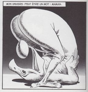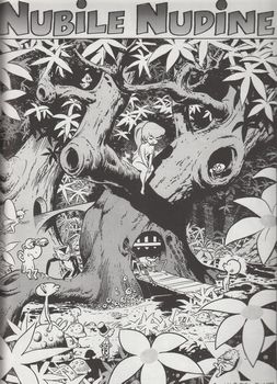 remarques: | album broché grand format, N&B, 60 pages, éditeur Fromage (Echo des Savanes) préface: il était une fois... Wood by Janine Bharucha petite biographie de Wallace Wood qui après la guerre travaille pour E.C. Comics, est dessinateur de publicité, dessine nombre d'illustrations pour les Pulp Magazines et Mad magazine, par la suite, il créé son propre récit d'heroïc-fantasy: le roi du monde qui le fit connaître dans le milieu de la BD Wood présente ici un récit porno-érotique en heroïc-fantasy basé sur les contes de Grimm et Perrault ainsi que Lewil Caroll 1/ Malice au pays des merveilles qui court après le chaud lapin, le Flasher-Fou, Clitonette, la chatte baveuse, la reine des tantes et qui cherche à sortir de son trou en changeant de taille >> p. 17 la moule à barbe géante 2/ Hansel et Gratte-Selle avec la sorcière et le prince des crapauds 3/ les super kozmiques exploits du dessinateur raté parodies sur quelques dessinateurs BD dont Albert Underzound avec le mot magique Astérix 4/ la Belle au poids gonflant la reine-mère suivie de près derrière par Blanche-Mèche qui deviendra reine à la place de la reine-mère 5/ Flasher Gordon qui combat avec Gale les Flatuloïdes et les Bugbaiseurs 6/ Nubile Nudine l'histoire de la petite fée Nudine (couverture d'album) à la recherche d'un homme et qui rencontre le petit Pip qui pour se faire aimer deviendra un géant androïde et qui fera à Nudine un autre petit Pip 7/ Dragonella abandonnée par ses parents, une petite fille est adoptée par une famille de dragons et sera appelée Dragonella, par la suite, elle trouvera un prince charmant mais celui-ci est déjà pourchassé par une meute de princesses qui veulent l'épouser 8/ l'histoire de Sandra Yon au royaume d'Hollywood, Sandra Yon est découverte comme nouvelle vedette par la Bigamount Society mais Sandra disparaît subitement, ayant perdu son soutien-gorge, elle sera retrouvée grâce à sa paire de nichons 9/ au royaume de Walt Disney (illustration de 2 pages sans texte), revue des héros de Walt Disney 10/ le prince désenchanté une orgie est organisée au château pour un prince riche, oisif et fort malheureux, mais durant la fête, une princesse embrassera le prince qui se retrouve transformé en un petit crapaud vert heureux 11/ mon univers petite description de New York et de Wallace Wood par lui-même >> p. 58 Dieu fit ses créatures à son image (crotte alors!) >> p. 59 l'art, ce mystérieux processus par lequel les phantasmes des uns viennent enrichir la vie des autres (Wood dixit) >> p. 60 la théorie de la création vue par Wood (voir photo annexée) >> un essai de parodies-érotiques-forniques-comiques par Wood (édité peut être spécialemment pour l'Echo des Savanes), mais n'est pas conteur et dessinateur érotique qui veut et Wood l'apprendra à ses dépens le texte n'est vraiment pas terrible et le graphisme ne vaut guère mieux (on est loin des formes alléchantes de Sally Forth) |