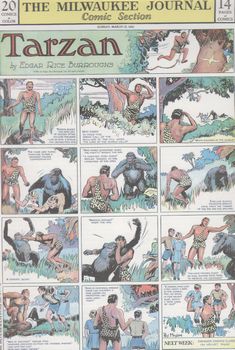 remarques: | first volume edited by NBM/Flying Buttress, 2nd printing (NBM being America's first publisher of graphic novels since 1976, located at New York with imprints such as Flying Buttress Classics Library, Amerotica, Eurotica and ComicsLit) under the supervision of Bill Blackbeard out of a sery of 18 volumes, all being accurate reproduction of the Sunday Pages in their full colour and in full size, each volume has about 52 pages, n.b. the sources of these Sunday pages are mainly from the Los Angeles Times and from the Milwaukee Journal edited by UFS (United Features Syndicate) >> comics syndicates >> see information volume 1 1931-1932 with dust jacket from 27.9.1931 (29) to 18.9.1932 (80) = 52 pages drawn by Hal Foster based on the novel of Edgar Rice Burroughs n.b. the pages 1 to 28 were drawn by Rex Maxon (not published in this edition) the complete reprint is finally here, Foster gets Tarzan off to a flying start with French legionnaires in a fight against Arab tribesman, later he is rescued by beautiful Hulvia the High Priestess, a feat he returns twice in kind for the sultry Lenida the Lion-Tamer Bill Blackbeard's introduction covers the first 6 months of Sundays done by Rex Maxon, the volume includes following episodes (number of pages): - hawk of the Desert: 13 - Tarzan's First Christmas: 1 - Tarzan and the Fox: 1 - the Dance of Victory: 1 - aboard a Slave Ship - the Baby of the Apes - the Black Pit - Hulvia the Beautiful: 11 - Lenida the Lion Tamer: 7 - the Return of Korak: 8 - the Elephants' Graveyard: 7 - into the Primeval Swamp part 1: 3 n.b. some pages were illustrated in black and white by Hal Foster from 7.1.1929 to 16.3.1929 stating the origin of Tarzan under the title "Tarzan of the Apes), one of these pages is presented at the beginning of this album giving information and presenting Tarzan's new adventures, from 16.8.1931 each weekly episode appeared with a title on each page 1/ introduction by Bill Blackbeard - 27.9.1931 Harald Foster takes over after the deception caused by previous Tarzan's illustrator Rex Maxon who made of Tarzan rather a kiddy character, instead that of a lord of the jungle - the first 28 pages made by Rex Maxon appeared in the Sunday pages from 15.3.1931 to 20.5.1931 and are not reprinted in this volume 1, except the first page that appeared on 15.3.1931 (see enclosure) as an example of the design work of Maxon (Tarzan and the twins) - description of the unfortunate pages of Rex Maxon which start with Tarzan rescuing in the jungle two foundlings being Bob and Mary and continuing in a rather childish development, whereas the first Foster's page on 27.9.1931 constituted the effective introduction of an adult adventure feature >> strong critic by Blackbeard to Rex Maxon but also to Frank Hoban (illustrator of the covers of three Blue Book magazines 1928-1930) - the idea of bringing Tarzan into comic strips was put by Joe H. Neebe who was like Foster an advertising agency executive - J. Allen-St.John (another illustrator of Tarzan's cover books 1920) was the most famous artist to paint Tarzan after Foster and Hogarth - the first cover book was done by Clinton Pettee in October 1912 for ERB (Edgar Rice Burroughs) 2/ the story following the script of Rex Maxon, Tarzan is saved by his old friend: captain D'Arnot arriving with an aeroplane, follows the story of D'Arnot about his engagement in the French foreign legion; Tarzan and D'Arnot deliver food to a beleaguered French Fort in the desert, Tarzan is taken prisoner with D'Arnot and lieutenant Carnot by the sheikh Abd-el-Krim, chief of desert-trained tribesmen, then delivered by a dancing girl who is shot dead during their flight, afterwards Tarzan is shown celebrating his first Christmas in England, then he rejoined his beloved jungle, big fire in the jungle, problem with the moorish slavers, then Tarzan meet the pigmy tribe and their blonde priestess Hulvia, the story of the white woman Hulvia who has become unwillingly priestess of the black warriors, Tarzan would promise to find a hero-mate for Hulvia and Tarzan finds the young explorer Tom Barry afterwards Tarzan makes the acquaintance of a mysterious woman with the black mask who turns out to be the famous lion-tamer Lenida, the story of Lenida who during a representation was badly mutilated in the face by a lion, she is now willing to take from Hulvia the role of priestess of the black warriors - later on Tarzan meets his son Korak nicknamed the killer (first and last mention of Korak as son of Tarzan), fight against Bolgani the giant-gorilla and afterwards against a pack of other gorillas, Korak is badly wounded and Tarzan is in great danger but both are saved by Tarzan's friends: Tantor the elephant and the Waziri spearmen coming to their rescue >> page 31.7. Korak the white bwana is taken care of by the Waziri and disappears of the adventures of Tarzan meanwhile, Tarzan meets again his little monkey Nkima and receives from Muviro, chief of the Waziri a mysterious message written in blood on a torn piece of shirt, it said: "help at the elephants' graveyard signed by Erich" Erich von Harben, an explorer, is a good friend of Tarzan who decides immediately to go to his help, during his travel Tarzan is injured by a stone and is himself rescued by some great apes of Tarzan's tribe, then Tarzan arrives at the elephants' graveyard where he finds von Harben badly injured and confronted with prehistoric monsters, the two have to retreat and return to gather strength but Tarzan will return to the graveyard, meanwhile flinging off the last remnant of civilization, Tarzan rejoined one of the leaping horde of the apes in the mad dance of the dum-dum in the light of the moon >> pages 18-10, 25-10, 1-11, 17-7 Tarzan make full use of rifle and gun and even of a machine gun >> page 20-12-1931 the message of Tarzan (well written) >> page 10-1-1932 tigers in Africa? >> page 17-7-1932 the hand of Tarzan >> page 28-8-1932 Tarzan's great fear (last panel) >>