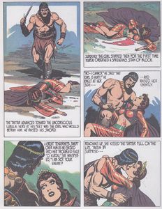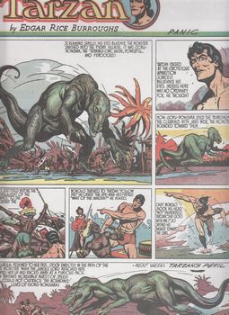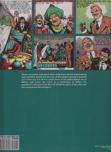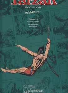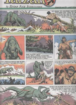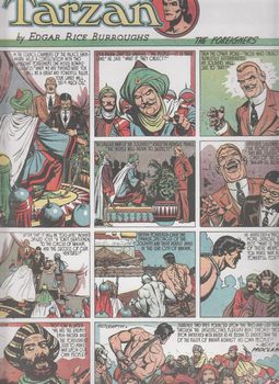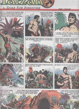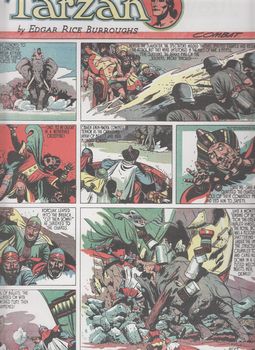 remarques: | fourteenth volume edited by NBM/Flying Buttress (NBM being America's first publisher of graphic novels since 1976, located at New York with imprints such as Flying Buttress Classics Library, Amerotica, Eurotica and ComicsLit) under the supervision of Bill Blackbeard out of a sery of 18 volumes, all being accurate reproduction of the Sunday Pages in their full colour and in full size, each volume has about 52 pages, n.b. the sources of these Sunday pages are mainly from the Los Angeles Times and from the Milwaukee Journal edited by UFS (United Features Syndicate) volume 14 1944-1945 with dust jacket from 12.9.1944 (705) to 2.9.1945 (756) = 52 pages drawn by Burne Hogarth based on the novel of Edgar Rice Burroughs Tarzan encounters with shock many of his forest friends imprisoned in cages and then quickly becomes one of the trapped specimens himself but as it turns out, it is all for a great circus of the golden-domed city of Bakhir, and worse, the circus is a contrivance to deflect the population's attention from the evil oil-thirsty plans of the ruler and two arrogant axis-like foreigners; the volume includes following episodes (number of pages): - Tarzan against the Nazis, part two: 27 - Tarzan against Goru-Bongara Monster: 17 - Tarzan against Orizu Khan, part one: 8 no introduction a) Tarzan against the Nazis, part two (and against the tyrant Emin-Nagra and the hunter Korojak), p. 705-731 (27) on the search of the mysterious thundersticks, Tarzan discovers an encampment where his forest friends are closed in cages, the hunter Korojak explains to Tarzan that this has been ordered by his master Emin-Nagra but before further explanation is given, Tarzan has to return to Bulak's tribe to save the white ape from the rite of death, Tarzan escapes with Bulak but dashing both from a broken branch, they are captured by Emin-Nagra's hunters and taken to the golden-domed city of Bakhir where two foreigners: the German Krieger and the Japanese Bushido want to seize the oil fields of the Bakhir country >> p. 711 the horde of hardened tough adventurers accompanying Krieger = the nazi soldiers at Bakhir, the beasts are made hungry for the circus games in which Tarzan should be the first victim, but Tarzan is saved by Tantor his faithful elephant: subdued by Tarzan's courage, the Bakhir people rebel against their tyrant Emin-Nagra, but the nazi soldiers fire at the crowd however Tarzan and his beasts, using the mighty force of Tantor come to the rescue, they manage to break out of the city and take refuge in the jungle where Tarzan will train the survivors of the Bakhir's massacre to guerilla warfare >> p. 714-716 the circus games >> p. 717/718 the charge of the mighty Tantor one day, Tarzan alone makes a raid into the city and eliminating a guard he disguises himself with his clothes and by that way he manages to enter the palace of the tyrant, he is however soon discovered by Korojak but saved by Bulak the white ape which has followed Tarzan's trail >> p. 719/720 one of the very few occasions when Tarzan is dressed >> p. 721 some nice designs of the white ape's faces meanwhile the whole nazi force is attacking Tarzan's warriors, but Tarzan has prepared a trap for the nazis by conveying oil into a river of fire towards the nazi armed forces blocked in a narrow pass, thus by ruse, men and animals succeed in routing the evil forces >> p. 719, 721 and 726 Tarzan's and Bulak's narrowing eyes are a bad omen for their enemies >> p. 725/726 pollution is not yet a great problem at that time but it is of course war time >> p. 728 Tarzan the big tumbler (turning over while flying) >> p. 729 Achtung said the nazi repelled, the nazi forces take refuge in the arsenal, but with a last onslaught, Tarzan sets the arsenal afire which is destroyed by a mighty explosion and the villains Emin-Nagra, Korojak and Krieger meet also their death fate (but what about Bushido?) b) Tarzan against the monster of Goru Bongara, p.732-748 (17) Tarzan on his way to his beloved jungle discovers a chaotic jungle with skeletal remains and he is trapped in a pit from where he can hear the vibrations o fheavy foot-steps, he is later on rescued by the fabulous pygmies of the African jungle led by their king Bokolo; the pygmies bring Tarzan to their village in order to sacrifice him to their god together with the young lady Lurulai, but at this very moment, the monster, a reptile colossus named Goru Bongara by the pygmies invades the village >> p. 733 the fabulous pygmies and >> p. 735 the pygmy village with its grotesque idol Tarzan taking Lurulai in his arms tries to escape from the monster, but they are going to be caught, when Bokolo shows them a narrow passage in the mountain that cannot be entered by the monster >> p. 738 Goru Bongara, the giant carnivorous reptile >> p. 741 the now warm and friendly pygmy people Tarzan, clever as ever, plans to destroy Goru Bongara by using its own power, for that purpose Tarzan with the pygmies prepares a formidable trap against the beast and finally with a big spear, Tarzan gives the death thrust to Goru Bongara >> p. 744 the trap set up by Tarzan to eliminate the giant reptile >> p. 744 from that page on, Tarzan wears again a leopard-coloured loin-cloth c) Tarzan with Prince Kurdu the Tartar against Orizu Khan p. 749-756 = 8 pages after his victory on the beast, Tarzan meets Kurdu the Tartar on the way to reconquest his kingdom against Orizu Khan >> p. 749 the story of Kurdu, son of a great khan whose throne was usurpated by Kurdu's uncle Orizu Khan and his wife Sulama, Lurulai being Sulama's sister because of Lurulai who is considered as a spy by Kurdu, Tarzan and Kurdu start a fight but Kurdu is no match for the mighty lord of the jungle, however Tarzan, victorious, accepts to give command of the party to Kurdu but before assailing Orizu Khan, Kurdu must take possession of the sceptre and sword being the symbols of justice as well as power to his subjects later on Lurulai is oblige