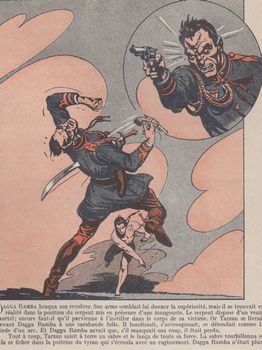 remarques: | titre complet: Tarzan et le tyran ou Tarzan contre Dagga Ramba (= un genre de Mussolini noir) 48 pages, 50% couleur, by Hogarth, adaptation Vic Chevet sur le chemin du retour, Tarzan rencontre aux abords d'un désert une caravane de nomades dont il sauve la princess Ta'ama des griffes d'un léopard, mais par ce fait il s'attire la jalousie du sheik Numali épris de la princesse, Tarzan accompagne la caravane de la princesse qui est attaquée par les askaris du dictateur tyran Dagga Ramba, Tarzan réussit à prendre la fuite et tombe inopinément sur son vieil ami Kamur, roi des Ibeks, tous deux partent ensemble délivrer Nikotris, femme de Kamur, et Ta'ama toutes deux prisonnières dans la forteresse de Dagga Ramba Nikotris sera délivrée, mais Tarzan et Ta'ama restent prisonniers, la forteresse sera prise d'assaut par les Ibeks, toutefois, par manque de moyens, leur attaque échouera, Tarzan part chercher du secours chez les bédouins et à la cité de Soufara chez l'émir, père de Ta'ama, une dure traversée où Tarzan manque de périr de soif peu après Dagga Ramba met le siège devant Soufara et avec Ta'ama comme otage demande la reddition de la cité, avec l'aide de l'armée de l'émir, des bédouins, des guerriers Touareg et du peuple des Ibeks, Tarzan réussira à éliminer le tyran Dagga Ramba et son acolyte Numali et bien sûr à délivrer la jolie princesse Ta'ama (huitième amoureuse de Tarzan dans ses aventures) >> p. 5 la lutte contre le léopard: bras puissants contre pattes monstrueuses, ongles contre griffes, poitrine virile contre poitrail bestial >> p. 7 Stamboul au lieu d'Istamboul, question de censure? (il est mentionné Istanbul dans la version originale anglaise) >> p. 13 une action peu vraisemblable, mais originale (le lancement par Tarzan, sur deux vignettes, de Nikotris au-dessus des remparts) >> p. 25 la parole d'honneur de Tarzan est irrévocable >> un album qui reste dans la moyenne avec un graphisme un peu moins affiné que les deux précédents et où Tarzan dans le désert est confronté à une guerre moderne |