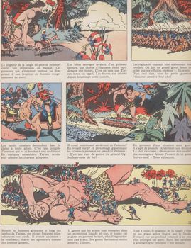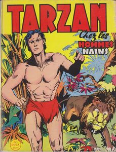 remarques: | 48 pages, 50% couleur, texte sous image 1er épisode: les chasses de Tarzan (by Hogarth et Lubbers), réédition de Hachette mais cette fois-ci, il s'agit d'un rhinoceros (capturé vivant) et d'un éléphant-fou qui sera abattu et qui deviendra un gros rôti pour les indigènes et de l'ivoire pour les marchands n.b. heureusement il ne s'agit pas de Tantor >> p. 1 Tarzan philosophe: "je dois sans cesse essayer de rétablir la paix entre les hommes et les animaux et aucun n'est vraiment heureux" songe-t-il avec tristesse >> p. 3 Tarzan a trop de volonté pour céder à la violence 2ème épisode: sans titre, by Lubbers Tarzan délivre la tribu des Cayas du pillage et de l'esclavage par les marchands d'esclaves (habillés en viking) >> p. 15 Tarzan est un dieu pour les Cayas 3ème épisode: sans titre, by Lubbers Tarzan au prise avec le chasseur-aventurier Smith (quelque ressemblance avec Dester Mollu de Hogarth), Tarzan sauve la princesse Amylis des griffes du misérable aventurier >> p. 17 on mentionne à nouveau un tigre dans la jungle africaine 4ème épisode: Tarzan chez les hommes-nains by Lubbers Tarzan se retrouve dans une région peuplée d'êtres minuscules (genre liliputien), Tarzan prend parti pour le général Og dans une bataille contre les guerriers du général félon Zavour, malgré sa grande taille, Tarzan est vaincu par une multitude de soldats semblables à des fourmis, Tarzan est emprisonné, mais fait connaissance avec Zorah, femme d'Og et avec le savant Reggio qui sait réduire la taille des hommes et des animaux, Tarzan devient temporairement un homme-nain >> p. 35 Tarzan reçoit 200 coups de fouet sans sourciller Tarzan et ses amis: Og, Zorah, Reggio et la reine repentie réussissent à s'enfuir et après que ses compagnons aient trouvé refuge dans une autre partie de la contrée, Tarzan retourne dans sa chère jungle où il retrouvera lentement sa taille originale >> p. 40 le combat contre les civettes >> p. 41 la reine qui voudrait qu'on lui change le coeur afin d'apprendre à aimer son prochain n.b. cet épisode a paru dans le magazine de Tarzan (nos 240-255,1951) 5ème épisode sans titre, by Lubbers Tarzan venge Freddy le chercheur de diamants qui a été escroqué >> p. 46 dans la jungle, les bêtes malfaisantes finissent toujours par être tuées >> un pauvre album, texte et scénario sans grande valeur, du copiage et du rafistolage (sauf peut'être l'épisode de Tarzan chez les hommes-nains qui présente quelque originalité), graphisme inélégant de peu d'intérêt, un mélange d'aventures sans intérêt avec Tarzan |