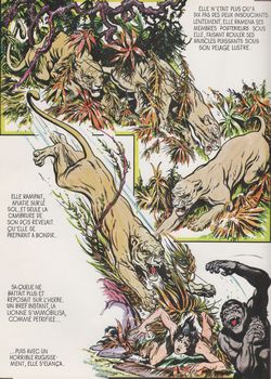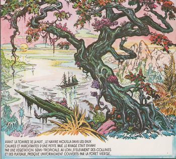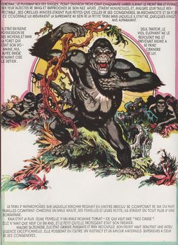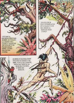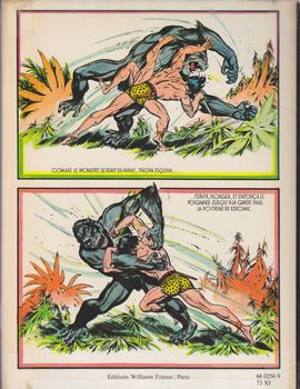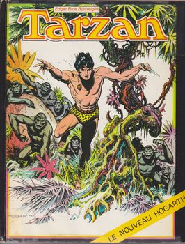 remarques: | ** état TBE mais jaquette fixée à la couverture par du scotch invisible format 21,5x28,5cm, 160 pages dont 122 pages dessinées par Hogarth 1/ Hogarth, le magicien by Maurice Horn version picturale de "Tarzan of the Apes", remake de la bande de Hal Foster, publiée en N&B et redessinée par Hogarth 20 ans après avoir produit sa dernière planche de Tarzan en 1950, hommage à Hogarth (1911-1996) et biographie Hogarth étudie le dessin à l'Art Institute de Chicago et à 18 ans réalise sa première BD "Ivy Hemmanhaw" sans succès, en 1935 au Mac Naught Syndicate, il reprend "pièces de huit", une histoire de pirates et en 1936 il devient le successeur de Hal Foster pour Tarzan >> p. 6 analyse du style de Hogarth (caractère tragique avec des visages tourmentés de passion et de haine) >> p. 9 chronologie des aventures de Tarzan par Hogarth 1945, création de Drago, un Tarzan argentin juvénile avec son lieutenant Tabasco contre le méchant Zodiac, tenant le milieu entre le carnaval et le grand guignol, récit qui n'eut pas le succès escompté puis Hogarth reprend Tarzan de Rubimor d'une façon magistrale en produisant en parallèle une bande humoristique "Miracle Jones" qui ne connut à nouveau pas de succès, en 1950, Hogarth abandonne Tarzan et se consacre à la School of Visual Arts, il sera l'auteur de trois ouvrages: "dynamic anatomy", "drawing of the human head" et "dynamic figure drawing", étudiant aussi la technique narrative dans la bande dessinée >> p. 13 la progression du style de Hogarth point culminant avec "Tarzan et les Aventuriers" (influence de Michel-Ange, des estampes japonaises, notamment dans le traitement de la flore, du baroquisme = accumulation bizarre et inattendue, de l'expressionnisme = projection d'une subjectivité qui tend à déformer la réalité pour inspirer au spectateur une réaction émotionnelle et surréaliste le corps de Tarzan que Hogarth va s'acharner à reproduire dans toutes les positions possibles et impossibles et dans son graphisme, Hogarth va s'efforcer aussi de représenter tous les éléments de la technique cinématographique (plongée, contre-plongée, panoramique, profondeur, etc) >> voir aussi la critique de Lacassin dans son livre "Tarzan ou le Chevalier crispé" (1971); Hogarth a fait de la BD un art, un très grand art et aucun autre dessinateur ne pourra égaler son graphisme identification de Tarzan, seul et à moitié nu, correspondant au mythe du citoyen-ouvrier ordinaire qui doit survivre dans l'Amérique de la grande dépression (période Hogarth), Tarzan est peut'être un demi-dieu, c'est en tout cas un héros authentique, hors de l'ordinaire et un idéal, il n'est ni esclave ni maître, c'est un héros défenseur de la justice, de l'égalité et de la liberté, un héros intelligent, mais humain et parfois même philosophe >> p. 16-28 les nombreuses critiques qui font hommage à Hogarth >> p. 29 bibliographie des oeuvres sur Hogarth dont les principaux - history of the comic strip (1968) by Couperie+Horn - Tarzan ou le chevalier crispé (1971) et Hogarth entre le merveilleux et la démence (1965) by Francis Lacassin - les animaux vus par Tarzan (1965) by Strinati - the art of comic strip (1971) by O'Sullivan 2/ biographie de Edgar Rice Burroughs né en 1875, accumule les échecs, il écrit son premier roman en 1911, "princess of Mars" qui sera considéré comme un tournant de la science-fiction contemporaine, le succès est mitigé, mais en 1912 son roman "Tarzan of the Apes" lui apporte la consécration, il deviendra même le best-seller de 1914 en 1918, Tarzan est porté au cinéma, c'est à nouveau un triomphe, devenu riche, Burroughs achète un domaine qui sera baptisé "Tarzana ranch" et fonde la même année la "Edgar Rice Burroughs Inc.", en 1941 il est correspondant de guerre, il meurt en 1950, Burroughs aurait écrit dans une dernière ligne de la dernière aventure de Tarzan un message d'adieu exprimant "mon Dieu, merci pour tout" 3/ adaptation picturale des 37 première planches de "Tarzan of the Apes" par Foster en 1929, redessinées par Hogarth en 122 planches (divisées en deux livres de 61 pages) mais Hogarth ne continue pas la saga des planches 37 à 75 mentionnant la présence de Jane et de Clayton >> résumé complet voir Phénix Spécial no 1 résumé du récit: départ en 1888 pour l'Afrique de John Clayton = lord Greystoke avec sa femme Alice pour l'Afrique, naufrage vers le Gabon ou le Congo actuel, naissance de Tarzan, lutte contre les grands chimpanzés de Kerchak, mort d'Alice, puis de lord Greystoke, tué par un grand singe Kala la guenon devient mère adoptive de Tarzan qui veut dire peau blanche dans la langue mangani, combats contre Sabor la lionne et Tublat, mâle de Kala, exploration de la cabane Greystoke, Tarzan y découvre un couteau et apprend lui-même à lire et écrire combat contre Bolgani le gorille, Tarzan participe à la cérémonie du dum-dum (= danse de la mort par les singes), puis Tarzan tue Tublat qui maltraite Kala, premier cri de victoire exprimé par Tarzan, il devient alors l'ami de Tantor l'éléphant Kulonga, le guerrier noir, tue Kala, vengeance de Tarzan sur Kulonga qui est poignardé à mort, Tarzan découvre que l'on peut tuer par haine et par plaisir (ce que font les hommes), mais sans frénésie, Tarzan s'empare des armes de Kulonga et revêt son pagne, Tarzan n'est plus complètement nu avec l'arc et les flèches, Tarzan vaincra Sabor la lionne, finalement Tarzan tue en duel Kerchak et devient roi des singes n.b. remarques sur les illustrations de Hogarth (pagination complète) livre premier: >> p. 46 la flore luxuriante mi-japonaise, mi-africaine >> p. 53 la villa Greystoke >> p. 59 la jungle qui se manifeste lors de la naissance de Tarzan >> p. 64 Kerchak le terrible >> p. 70 le fils de lord Greystoke têtant le sein de Kala la guenon >> p. 81 une intelligence supérieure va de pair avec une plus grande rapidité (ou habilité?) livre deuxième