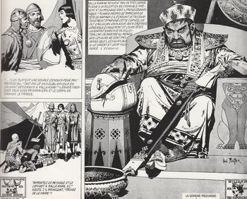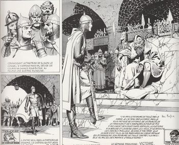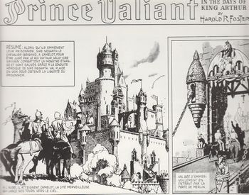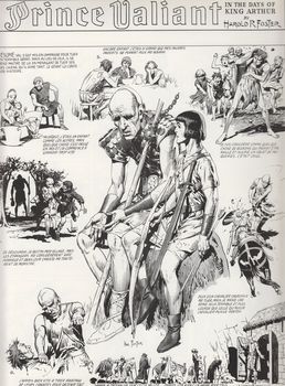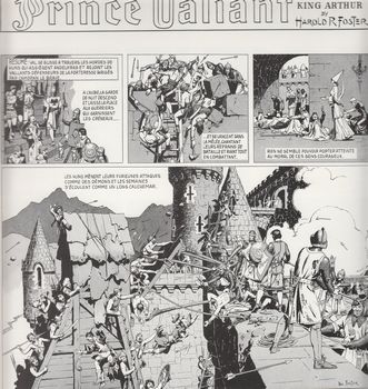 remarques: | titre complet: Prince Valiant (in the days of king Arthur) tome 1 enfance de Valiant = Val, la cour du roi Arthur et l'invasion des Huns 181 planches du 13.2.1937 au 28.7.1940 (graphisme s'améliorant nettement à partir de la planche 65 du 7.5.1938), livre cartonné N&B avec 2 jaquettes, l'une rouge l'autre blanche marquée tome 1 n.b. BE+ car jaquette intérieure attachée au livre par du scotch invisible (jaquette rouge bien séparée) mais autrement en parfait état et TBE (côte BDM Euros 50 à 75.- en BE) 1/ préface: king Harold et ses chevaliers by Pierre Couperie - biographie de Hal Foster et présentation >> voir aussi phénix spécial no 1 sur Tarzan - Prince Valiant voit le jour le 13.2.1937 publié par le King Feature Syndicate KFS (= groupe media Hearst) - la série allait paraître dans 189 journeaux différents en 14 langues dont Prince Vaillant, Principe Valiante, Prinz Eisenherz, - Prince Valiant fut aussi porté à l'écran en 1953 par Henry Hathaway avec Robert Wagner, James Mason et Janet Leigh - tout en produisant Prince Valiant, Foster s'est livré à des travaux d'illustrations tel "the mediaval castle" qui raconte la vie de deux jeunes nobles - la série Prince Valiant dura 33 ans avec plus de 1720 planches, c'est certainement une des plus longues bandes dessinées jamais produites, - les épisodes ne se succédaient pas au hasard, mais développaient les moments d'une vie avec son unité organisée, - ayant créé un univers complet, Foster y dissémina des dizaines de personnages que Prince Valiant rencontra selon la logique de ses voyages - Foster pour son oeuvre aura utilisé une documentation considérable: sur l'histoire, le caractère des pays visités et les paysages - Prince Valiant est un modèle de courage et d'honneur mais peut parfois être aussi cynique - Prince Valiant a paru en France dans "Hop Là" et dans "le Journal de Mickey", mais passablement tronqué, il fut aussi édité en album par a) Serg 3 albums, 1970-1977 sur la période 1937-1946 (les meilleurs albums) b) Hachette 4 albums sans ordre précis: prince Vaillant (1957), le complot diabolique, l'épée enchantée et le roi de Thulé (1974) c) Slatkine 7 albums, 1980-1983 sur la période 1937-1951 d) Futuropolis 5 albums, 1986-1989 sur la période 1937-1948 e) Zenda (la suite de Slatkine) 17 albums couleur, 1987-1997 sur la période 1951-1971 soit 1/ la révolte des saxons 2/ le paladin de la croix 3/ la légende de sir Quintus 4/ à la recherche de Gauvain 5/ la quête du Graal 6/ le mur Hadrien 7/ la statuette indienne 8/ Aleta 9/ la cité maudite 10/ le prince de Thulé 11/ les épreuves d'Arn 12/ la cour du roi Arthur 13/ le grand khan 14/ les princes-chevaliers 15/ le royaume de Camelot 16/ les îles brumeuses 17/ la chanson de geste n.b. la meilleure édition pour la qualité graphiste est celle de Serg - John Murphy, assistant de Foster, continua la série en 1971 quand Foster décida de se retirer, mais Murphy ne réussit pas à reproduire l'élégance et la finesse du style de Foster 2/ l'histoire page avant-garde: carte des voyages de Valiant pour le tome 1 a) l'enfance de Prince Valiant (= Val) Agnar, roi de Thulé, père de Val, vit exilé sur une île dans les marais de la côte est de la Bretagne (Angleterre) - chasse au lézard géant par le jeune Val - rencontre avec Thorg le bossu et sa mère la sorcière Horrit qui révèle à Val des prophéties sur son avenir - rencontre aussi avec les chevaliers Lancelot et Gauvain ainsi qu'avec le chevalier-brigand Negarth - combat contre le dragon 2/ la cour du roi Arthur >> pl. 19 Camelot, la cité royale Val est reçu par le roi Arthur et son épouse Guenièvre, il devient l'écuyer de Gauvain, complot contre Gauvain et Val au château d'Erriewold, justice pour la gentille Ilène, l'ogre du bois de Sinistar >> pl. 46 la ruse de Val avec le masque de chauve-souris géante le château de Branwyn, le premier amour de Val pour Ilène qui est toutefois promise au prince Arn, délivrance de Gauvain prisonnier de la magicienne Morgane, demi-soeur du roi Arthur au château de "douloureuse garde" >> pl. 58 Valiant envoûté par Morgane cherche conseil auprès du sage Merlin >> p. 62 la porte mouvante dans la demeure de Merlin n.b. les épées enchantées: Excalibur, l'épée d'Arthur et Flamberge, l'épée chantante enlèvement d'Ilène par Thagnar le viking, Valiant et Arn sur la piste d'Ilène >> pl. 71 combat sur le pont de Dundorn mort d'Ilène, paix entre Valiant et Arn, retour à Camelot, participation au grand tournoi, l'invasion des saxons >> pl. 102/103 le grand combat contre les saxons défaite du roi saxon Horsa, Val devient chevalier de la Table Ronde, nouvelle prophétie d'Horrit, de retour chez son père, Val arrange la destitution du roi saxon Sligon en faveur d'Agnar >> pl. 81 la cour du roi Sligon >> pl. 100 les chevaliers de la table ronde: le courtois Lancelot, Tristan le fort, Ulfins, Brasthias le toujours fidèle, Key le sénéchal, Bedivère qui servira le roi jusqu'à la mort, Gauvain l'insouciant, sire Mordred qui deviendra plus tard un traître, sire Hector le garde du roi et le sage Merlin aventures amoureuses avec Clarisse, fille du roi Sligon, après avoir arrangé l'union amoureuse entre Clarisse et Alfred, Valiant repart pour de nouvelles aventures, l'emblème de Prince Valiant: un étalon rouge (red stallion) n.b. le graphisme s'améliore nettement à partir de la planche 65 (7.5.1938) et à partir de la planche 99, des petits timbres à découper (personnages et armes+objets divers) sont ajoutés en bas des planches c) combat contre les Huns Valiant apprend que Rome est tombée aux mains d'Attila et de ses huns - Valiant déclare la guerre aux huns et part rejoindre la forteresse d'Andelkrag en Pannonie qui résiste toujours encore aux assauts des huns >> pl. 120 la forteresse d'Andelkrag commandée par le duc Camoran et ses chevaliers-troubadours malgré une défense héroïque, la forteresse t