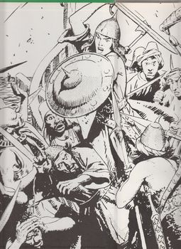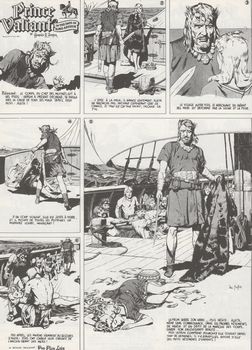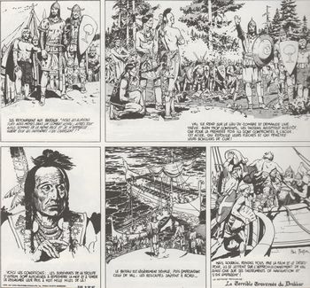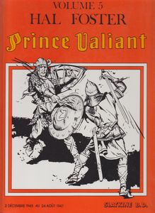 remarques: | premier album Slatkine collectionné la série Slatkine comprend 7 volumes N&B de 1980 à 1983 seuls les 3 derniers albums sont collectionnés ici, pour les débuts de Prince Vaillant >> voir albums Serg et Futuropolis tome 5: 1945 - 1947 au pays de Camelot et enlèvement d'Aleta, 91 planches, reprise des planches 2.12.1945 (pl.460) au 19.5.1946 (pl.484) = 25 planches de l'édition Serg puis planches 26.5.1946 (pl.485) au 24.8.1947 (pl.550) = 66 planches inéditées par Serg 1/ au pays de Camelot expédition contre les saxons avec le comte Puny alias Aleta, rencontre avec les hors-la-loi de Hughes-le-Renard (= genre de Robin des Bois), lutte au bâton avec le brigand Cyrille, Valiant réussit à rallier les hommes de Hughes-le-Renard contre les saxons, éloge de la forêt, guerre à nouveau contre Horsa, roi des Jutes et des Saxons, les hors-la-loi deviennent les éclaireurs dans l'armée du roi Arthur complot de sire Mordred pour diffamer Lancelot et Guenièvre qui s'aiment en secret, Aleta sauve la façe en s'accusant elle-même à la place de Guenièvre devant le roi retour à Thulé, révolte de Gunguir, comte d'Overgaard contre le roi de Thulé >> pl. 509 Ufrun le féroce, fils de Gunguir, le plus grand écumeur viking des mers duel de Valiant contre le champion de Gunguir, rencontre d'Aleta avec le roi de Thulé, philosophie sur les droits et peines des rois, l'entêtement du vieux, mais puissant comte Jon écarté par le charme d'Aleta, Aleta fait le ménage chez le comte Jon, chasse à l'ours et au canard 2/ l'enlèvement d'Aleta par Ufrun Aleta est capturée et amenée sur le drakkar d'Ufrun qui met voile vers l'ouest, il est pris en chasse par Valiant, la poursuite continue au-delà des îles Feroe via l'Islande et le Groenland, enfin on arrive au Canada après avoir passé la Terre Neuve, le détroit de Belle-Ile et l'île d'Anticossi, les drakkars remontent le cours du Saint-Laurent et arrivent au lac Ontario, rencontre avec les tribus indiennes, mort d'Ufrun qui est précipité dans les chutes du Niagara >> pl.545 le visage plein de haine et de peur de Ufrun avant de mourir Valiant retrouve Aleta qui attend un enfant, il décide d'hiberner au Canada, préparation de l'hébergement et de l'approvisionnement, la fabrication du pemmican à la mode indienne >> pl. 545 la construction d'une hutte indienne avec sauna les indiens qui considèrent Aleta comme une déesse, lui offre la servante Tellicum en plus de Katwein n.b. pour Foster, le Canada est pays bien connu d'oû les descriptions géographiques et culturelles bien détaillées, mais curieusement selon lui, les indiens du Canada adoraient l'or >> pl. 552 >> le graphisme reste acceptable bien que la qualité d'impression ne soit pas fameuse et le texte commence à devenir un peu lassant |