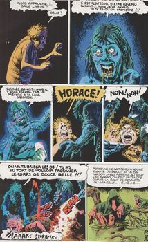 remarques: | album cartonné 50% couleur 50% N&B, 134 pages 1/ préface sur Corben by Marc Duveau Corben (1940-2020) se consacre au dessin animé de 1963 à 1972, puis se lance dans le underground comic, participe dès 1970 à Creepy, Eerie et Vampirella ainsi qu'à voice of Comicdom, dans Skull comics et weird fantasy il se lance aussi dans l'heroïc-fantasy et la science-fiction de la peur et de l'horreur, particularisme de Corben: les formes exagérées et les couleurs anormales 2/ courtes nouvelles en partie inédites: a) la cité morte de la peur N&B * exploration de la cité morte où se pratiquait la civilisation de l'or, cette cité disparue s'appelait le désert des esprits, visite de la cité par Boglan et Nipta dont la chevelure deviendra blanche par la peur b) des chatons pour Charlie * Charlie et Simon découvrent des chatons albinos dans un monde post-atomique, Luther le chef de la bande veut tuer les chatons pour les manger, mais Charlie s'enfuit et vivra seul avec ses chatons qui deviennent des fauves-géants qui le protègent c) le temple (du savoir) * Arnie et Edyl (Adam et Eve) revivent l'histoire du paradis terrestre, mais la fin de leur histoire est tout autre que celle de la bible >> page 35 Dieu = la grande mère d) Ogre 0 épisode en forme de photo-couleur où un ogre est transformé en un humain e) demoiselle en robe de dragon * la mutation des dragons à sens inverse f) fugue pour un espace perdu N&B exploitation et conquête spatiale sur fond de violence g) Bug N&B dans l'empire des fourmis h) voir, vous avez dire voir N&B la fille de l'espace dans un vaisseau spatial cybernétique ij) l'éveil N&B la machine à congeler, une affaire de cryogénisation k) Cdopey * les amours malheureuses de deux amants mutants, une affaire de dopage (graphisme et couleur d'un genre particulier) l) le bonheur de Benoit le boiteux * la belle et la bête, version horribilis ou l'amoureux éconduit m) le secret de Zokma N&B à la découverte d'un temple inca dont la populace fut éliminée par la peste n) going home * amours androïdes, la mort du capitaine Sloane = le dernier homme de la race humaine >> de courts récits au style typique de Corben, mais rien vraiment de spectaculaire |