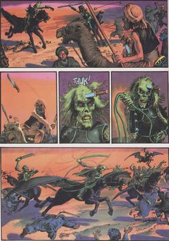 remarques: | 2ème édition broché + 8 pages inédites au total 102 pages 1/ préface de Harlan Ellison = hommage au graphisme de Corben, l'origine du conte des 1000 et une nuits = l'histoire sans fin que raconte Shéhérazade au sultant Shariar pour retarder l'exécution de la sentence de mort sur Shéhérazade 2/ le dernier voyage de Sinbad le marin, c'est le huitième, au pays des djinns à la recherche de son épouse Zulaykha enlevée par le démon Al Râ ad al Karif qui cherche vengeance sur Sinbad parce que celui-ci a tué par inadvertance la femme du démon qui avait pris la forme d'une chienne >> p. 22/23 le démon Al Râ ad al'Karif avec Akissa, une autre femme du démon qui fait semblant de trahir celui-ci (en fait le démon lui-même), Sinbad cherche l'aide de Zul Janahayn, le roi des génies (djinn = génie) Sinbad arrive à Ketra où il tombe dans les griffes de Ali Ben Abda, gouverneur de Ketra, ville qui fut détruite dans le passé par Zul Janahayn, car Ketra était une ville de lucre avec une vie orgiatique (similitude avec Sodome et Gomorrhe) >> p. 44 durant son périple, Sinbad et ses compagnons sont attaqués par des hommes-squelettes >> p. 66 l'histoire de la ville de Ketra Ali Ben Abda demande l'aide de Sinbad contre Janahayn, mais leur entreprise échoue, Sinbad ne retrouve pas son épouse toutefois, par ruse il réussit à vaincre le démon Al Râ ad al'Karif dans un combat final de retour à sa ville après un voyage sans succès, Sinbad se livre à la méditation, à l'humilité et aux plaisirs simples de la vie et par la suite, il retrouve son épouse, soeur de Zul Janahayn qui avait été mise à l'abri par celui-ci pour diminuer l'arrogance et éprouver le courage de Sinbad >> Corben donne ici avec Strnad dans le "shazam" de la magie orientale donnant une description des passions humaines et leçon de moral, le scénario est assez intéressant, mais surtout un bon graphisme de Corben, c'est de l'art et du bon art avec en plus une jolie couverture d'album annexes - couverture de l'album 1982 - extraits de l'album - couverture de l'album originale 1979 |