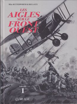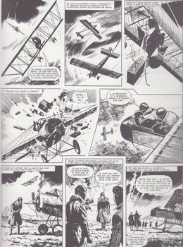 remarques: | titre original: eagles over the western front 1/ préface: les chevaliers du ciel peu de BD sur la 1ère guerre mondiale en son temps, peut'être la plus connue: Charley's war la 1ère guerre, c'est aussi la naissance de la guerre aéronautique qui fut propice à la fiction avec le nouvellement créé RFC (Royal Flying Corps) W.E. Johns a été dans le genre un précurseur, mais les comics dans ce genre n'apparurent vraiment qu'à partir des années cinquante "eagles over the western front" fut publié dans le périodique Look and Learn entre 1971 et 1973, écrit par Mike Butterworth et dessiné par Bill Lacey, le récit raconte l'histoire du Royal Flying Corps avec son héros Harry Hawkes (moins impulsif que Battler Briton dans la 2ème guerre), développement du RFC dès 1911 et au début de la 1ère guerre, l'Allemagne, question aéronautique, avec 230 appareils était en avance sur la France et la Grande-Bretagne tout d'abord avions de reconnaissance, les combats aériens entre avions ne commencèrent qu'en 1915 avec l'apparition de la mitrailleuse montée sur avion; ce fut le monde des chevaliers du ciel, un monde très éloigné de l'horrible massacre et de la saleté des tranchées, un "as" était le terme français désignant un pilote qui avait abattu 5 avions, par la suite apparut l'ère des bombardiers dont l'action resta toutefois encore modeste, le français Roland Garros aide à developper le système de tir par mitrailleuse, mais ce sera l'allemand Fokker qui mit au point un mécanisme permettant à la mitrailleuse de tirer à travers les pales des hélices 2/ la bande dessinée le jeune Harry Hawkes décide de s'engager en 1915 dans la Royal Flying Corps et reçoit de son oncle comme cadeau une automobile d'époque; les accidents ne sont pas rares avec les premiers avions Hawkes fait preuve d'adresse, mais ne peut empêcher dès le début de détruire deux des avions de la RFC, les premières missions sur le front sont difficiles et lors d'un vol, il est abattu par le Fokker d'Immelmann, l'as allemand surnommé l'aigle de Lille, toutefois Hawkes et son co-pilote réussissent à s'en sortir >> p. 31 première attaque sur un croiseur allemand par la suite, Hawkes effectue ses missions avec Jim Maginnis dit le chanceux qui veut le concurrencer en lui lançant des défis, mais Jim sera abattu par Greengrocer, pilote d'un Fokker après coup, ce sera Greengrocer qui se mesure avec Hawkes >> p. 41 le duel quelque peu cocasse entre Hawkes et Greengrocer qui est fait prisonnier un nouveau venu, Reade-Chivers, fils d'un général, fait de suite des cartons sur le front, il deviendra connu sous le surnom de faucon solitaire Immelmann le défie en duel, Hawkes soupçonne les succès de Reade de n'être pas réels et veut assister au duel sans se faire remarquer; il constate alors que Reade-Chivers fait semblant de se rendre, son adversaire sans méfiance s'approche de son appareil et se fait descendre au pistolet par Reade-Chivers qui est un excellent tireur Hawkes découvre la traîtrise et s'explique avec Reade-Chivers qui meurt dignement lors d'un duel loyal cette fois l'escadron de Hawkes se rend à Verdun pour épauler la résistance française, Hawkes devra se poser dans les lignes allemandes lors d'une panne et après une fuite abracadabrante, il réussira à rejoindre les lignes françaises >> p. 63 le spectacle des dandy boys joués par des pilotes allemands en fuite puis ce sera une mission inofficielle pour récupérer un tableau de Rembrandt dans les lignes allemandes >> p. 71 rencontre inopinée avec le Kronprinz et en fait le tableau se révèle être un faux Rembrandt mais de nombreux pilotes sont bientôt manquants et ceux qui restent font semblant de ne pas remarquer les chaises vides, toutefois, il faut trouver de nouveaux pilotes et ce sera une jeune femme qui déguisée en pilote remplacera son frère malade, pilote à la RFC elle deviendra un pilote expérimenté et courageux, mais qui a peur des souris Hawkes découvrira la supercherie, mais gardera le silence jusqu'à l'arrivée du frère à nouveau rétabli >> des récits assez intéressants, teintés d'humour et parfois plutôt originaux mais malgré tout qui manquent d'envergure avec un graphisme aussi un peu faible qui ne rehausse pas la valeur de la série n.b. les aventures de Harry Hawkes continuent dans deux autres albums: tomes 2 et 3 (2013) mais qui ne sont pas collectionnés ici; en fin d'album, les couvertures des deux prochains albums annexes - couvertures recto/verso avec un extrait de l'album - couverture du tome 2 |