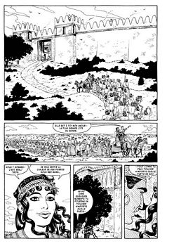 remarques: | paru en anglais en 2001 sous le titre "a thousand ships" l'histoire de la guerre de Troie, cité qui aurait été située sur la colline de Hisarlik en Turquie et dont le premier fouilleur fut l'archéologiste Heinrich Schliemann en 1870 n.b. l'âge de bronze est une série de bandes dessinées retraçant la guerre de Troie elle est écrite et dessinée par Eric Shanower (1963 - ) et publiée par Image Comics; la traduction française est publiée par Akileos dans la collection Regard Noir et Blanc, Eric Shanower a commencé ses premières recherches en 1991 et dessiné ses premières planches en 1998 ses sources sont nombreuses et diverses (tragédies grecques d’Eschyle, d’Euripide, de Sophocle, l’Iliade d’Homère, fables mythologiques d’Hygin, suite d'Homère de Quintus de Smyrne), une fois terminée, l’œuvre devrait compter sept volumes, avec une fin programmée aux alentours de 2020, soit après 25 années de travail à ce jour, la série a déjà été récompensée à deux reprises par un Eisner Award, malheureusement à ce jour (2024) les quatre autres volumes n'ont pas été publiés RESUME du récit Pâris, fils adoptif d'Agélaos, part pour Troie où il est reconnu comme un des fils de Priam, roi de Troie n.b. il avait été abandonné à sa naissance, car il avait été dit qu'il causerait la perte de Troie (prédiction renouvelée par Cassandre, la prophétesse de Troie) et Pâris choisit déjà d'épouser Hélène, femme de Ménélas, roi de Sparte, considérée comme la plus belle femme du monde d'alors retour d'Hector, qui veut épouser Andromaque, et d'Enée, un cousin qui veut épouser une fille de Priam l'histoire d'Hésione, soeur de Priam, enlevée en son temps par un roi achéen Pâris se déclare d'accord pour partir et obtenir la libération d'Hésione, mais en fait pour obtenir la main d'Hélène l'importance de Troie qui contrôle le détroit de l'Hellespont dont elle tire sa richesse à Sparte, la belle Hélène n'est pas heureuse avec son époux Ménélas et ne sera pas insensible au charme de Pâris de son côté, Thétis, mère d'Achille, demande à Poseidon de protéger son fils qui va trouver la mort lors de la guerre de Troie, elle envoie son fils chez le roi Lycomède sur l'île de Skyros pour l'éloigner, mais les achéens recherchent Achille, car il est dit qu'ils ne gagneront la guerre contre Troie qu'avec l'aide d'Achille et Achille préfère de toute façon une vie courte avec gloire qu'une vie longue sans gloire il part donc avec Agamemnon, mais auparavant il épouse Deidamie, fille de Lycomède avec qui il a un fils appelé Pyrrhus (Néoptolème) Ménélas avise son frère Agamemnon et son épouse Clytemnestre de l'enlèvement d'Hélène par Pâris, Priam refuse de rendre Hélène aux envoyés d'Agamemnon Hélène était la fille de Tyndare et de Léda de Sparte, Castor et Pollux étaient ses deux frères Nestor de Pylas, le Sage, se joint aussi à l'armée d'Agamemnon qui oblige par ruse Ulysse, roi d'Ithake, à quitter son épouse Pénélope et son fils Télémaque pour suivre l'armée d'Agamemnon à Troie Achille emporte avec lui Patrocle et ses myrmidons (guerriers féroces et courageux) il est dit aussi que la victoire sur Troie n'interviendra qu'après 9 années de guerre et que pour vaincre Troie, Agamemnon devra semer la discorde parmi les achéens (ce qui arrivera avec Achille) dernière page: l'appareillage des mille navires postface histoire de la série en bande dessinée sur la guerre de Troie par Shanower qui devait se dérouler en 7 volumes en fait il n'y aura à ce jour que 3 volumes, tome 2: sacrifice et tome 3: trahison l'auteur a voulu dans son récit (contrairement à Homère) minimiser l'influence des dieux et favoriser le côté humain Information 1/ dans la mythologie grecque, Andromaque (qui veut dire celle qui combat les hommes), fille d'Éétion, roi de Cilicie de Troade, était la femme d'Hector et lui donna un fils unique, Astyanax, qui fut précipité par Néoptolème, des remparts, lors du pillage de la ville de Troie privée de son père et de ses frères, tués par Achille, Andromaque voit bientôt réduite en cendres la ville de Troie dont Hector était le principal appui elle est livrée au fils d'Achille, Néoptolème, aussi appelé Pyrrhus, qui l'emmène en Épire et en fait son épouse 2/ Hésione est une princesse troyenne, fille de Laomédon et de la nymphe Strymo, elle apparaît dans la version apollodorienne de la "première guerre de Troie" entre son père et Héraclès, elle fut offerte en sacrifice pour apaiser un monstre marin envoyé par Poséidon pour ravager Troie, après que son père, le roi Laomédon de Troie, eut floué Poseidon Héraclès proposa de tuer le monstre en échange des chevaux immortels que reçut Tros, le grand-père de Laomédon, à la suite de l’enlèvement de Ganymède Héraclès sauva Hésione, mais, encore une fois, Laomédon ne s’acquitta pas de sa dette pour se venger, Héraclès, en compagnie de Télamon, monta une expédition punitive de dix-huit navires contre Troie à la suite de sa victoire, il tua Laomédon et ses fils, Héraclès offrit Hésione à Télamon et lui permit de sauver un de ses frères, celle-ci choisit Priam; de Télamon, Hésione enfanta Teucros plus tard, lorsque son neveu Pâris, fils de Priam, se rend en Grèce pour enlever Hélène, c'est avec le prétexte de rendre visite à Hésione 3/ Néoptolème ou Pyrrhus, fils d'Achille et de Déidamie (fille du roi Lycomède), il est élevé par ce dernier sur l'île de Skyros et, selon les Chants cypriens, nommé d'abord Pyrrhus, en référence aux cheveux roux hérités de son père son nom de Néoptolème est en fait dû à Phénix 4/ Hélène est la fille de Zeus et de Léda selon la légende, elle était la plus belle femme du monde, seule la déesse Aphrodite la surpassait elle est mariée à Ménélas, roi de Sparte, avant d'être enlevée par Pâris, cet événement décle