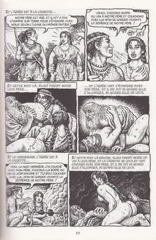 remarques: | titre en anglais: the book of Genesis illustrated by Crumb) livre N&B de 220 pages, un pavé biblique, page de garde: carte du monde d'Abraham (2000 B.C.) pour Crumb, c'est un changement de l'underground à la bible! selon Crumb, la Bible est un ouvrage collectif qui a évolué et s'est condensée sur de nombreuses générations avant d'atteindre sa forme définitive telle que nous la connaissons durant l'Exil à Babylone vers l'an 600 B.C; c'est la caste des prêtres qui, à cette période, a compilé et mis en ordre cohésif ce recueil d'histoires et légendes tissant parfois ensemble deux versions différentes du même récit et proclamant le produit fini saint et sacré cette Genèse illustrée par Crumb comporte 50 chapitres incluant: la création, Adam et Eve, Caïn et Abel, les généalogies, Noé et le Déluge, la "table des nations" la tour de Babel, Abraham et Sarah, Isaac et Rebecca, Jacob, Rachel et Léa, Juda et Tamar, Joseph et ses frères remarques >> p. 19 pourquoi être nu, c'est mal? - l'alliance de l'arche avec Noé >> p. 30 les animaux purs et impurs (ceux qu'on peut manger ou pas) - Noé fut le premier à planter la vigne et à s'enivrer - Nimrod le grand chasseur qui fonda les royaumes de Babylone,Akkad et Erek - avec Canaan, fils de Noé, se dispersèrent les clans des cananéens - Eber, fils de Canaan, de qui la tribu des hébreux tire son nom >> p. 46 Abraham au prise avec sa femme/soeur et le pharaon, (dans la Genèse, il y aura trois évènements de ce genre!) - dispute entre Saraï, épouse d'Abraham et de sa servante Agar qui enfanta Ismaël - l'alliance entre Dieu et Abraham est confirmée de par la circoncision >> p. 71 la destruction de Sodome et Gomorrhe - naissance d'Isaac et son sacrifice pour éprouver Abraham >> p. 88 le serviteur qui prête serment sous la cuisse d'Abraham - Rebecca devient l'épouse d'Isaac en acceptant de porter un anneau de nez en or >> p. 98 la lignée des fils d'Ismaël - l'histoire de Jacob et d'Esaü, Jacob prend le nom d'Israël après avoir lutté avec le messager de Dieu >> p. 142 les 12 fils de Jacob représentant les 12 tribus d'Israël >> p. 151 Joseph vendu par ses frères et c'est par Joseph que les hébreux de Jacob s'installèrent en Egypte, dans le pays de Goshen commentaires de Crumb en fin d'album - il existe beaucoup de parallèles entre les histoires de la Genèse et les anciens mythes de la Mésopotamie comme le raconte aussi la Torah qui comprend les cinq livres de Moise (= le Peutatoque) = Genèse, Exode, Lévitique, Nombres et Deutéronome - liens entre la famille d'Abraham et la civilisation avancée d'Ur - à noter aussi, les relations d'alors entre le patriarcat et le matriarcat - une genèse très détaillée et bien illustrée par le style particulier de Crumb (rien à voir avec le style de Gustave Doré) - un récit qui parle aussi beaucoup de semence, de guerre, de violence, de copulation et en particulier de la circoncision qui serait à l'origine de l'alliance entre Dieu et les hébreux, le peuple élu - le graphisme est intéressant, mais il faut être bien préparé pour la lecture du récit qui devient vite parfois quelque peu lassant n.b. par ailleurs ce récit serait fidèlement retranscrit avec chaque mot du texte original de la bible annexes - couverture de l'album - p.73 les deux filles de Lot qui n'ont pas d'hommes à leur disposition et qui couchent avec leur père (après lui avoir fait boire du vin) afin de garder vivante la semence de leur père et elles conçurent par leur père - l'aînée des filles:, d'un fils appelé Moab qui fonda les moabites - la cadette: aussi d'un fils appelé Ben-Ammi qui fonda les ammonites (>>> voir le chapitre Genèse 19, 30-38) Référence "the five books of Moise" by Robert Alter, ces livres reprenant l'histoire du peuple juif Information le Pentateuque désigne chez les chrétiens les cinq premiers livres de la Bible pour les juifs, ils constituent la Torah, la tradition en attribue la paternité à Moïse, mais la recherche moderne a pu établir qu'ils ont été composés à l'époque de l'exil à Babylone par de nombreux rédacteurs, ils présentent une version théologique de l'histoire du peuple d'Israël depuis la création du monde jusqu'à la mort de Moïse si, dans la religion juive, ils portent le nom de Torah, c'est-à-dire doctrine, ou enseignement, mais aussi loi, c'est parce qu'ils renferment, outre des récits historiques, tout un ensemble de prescriptions (religieuses, rituelles, culturelles, juridiques, etc.) qui constituent les bases du judaïsme, les lois alimentaires (cacherout) énoncées dans le chapitre 11 du Lévitique en sont un exemple parmi d'autres le Livre de la Genèse est le premier livre de la Torah (Pentateuque), et donc de la Bible, ce livre est fondamental pour le judaïsme et le christianisme n.b. le Pentateuque comprend Genèse, Exode, Lévitique, Nombres et Deutéronome alors que les deux livres précédents font une large part au récit, le Lévitique rompt l'histoire pour exposer une série de rites à accomplir - le livre des Nombres commence par le dénombrement des tribus hébreux, puis raconte le départ pour le Sinaï afin de conquérir la Terre promise - le Deutéronome se présente comme un long discours, tenu par Moïse aux Hébreux avant sa mort la Genèse est le récit des origines, il commence par celui de la création du Monde par Dieu, suivi d'un second relatant celle du premier couple humain ce second récit montre ensuite qu'Adam et Ève, qui forment ce premier couple, désobéissent, et sont alors exclus du jardin d'Éden Dieu détruit ensuite l'Humanité par le Déluge dont seuls Noé et sa famille sont sauvés enfin, Dieu différencie les langues et disperse l'Humanité sur la surface de la Terre, lors de l'épisode de la tour de Babel, après cela, l'essentiel de la Genèse est consacré aux histoires d'Abraham, de Jacob et de Joseph. le livre est anonyme, tout comme les autres livre