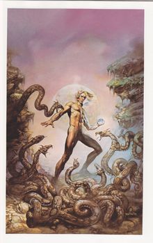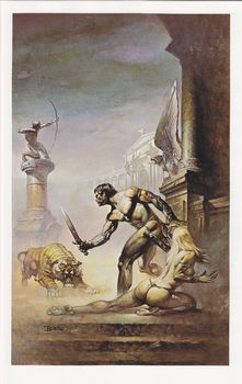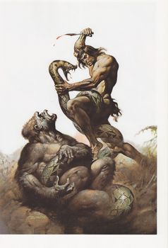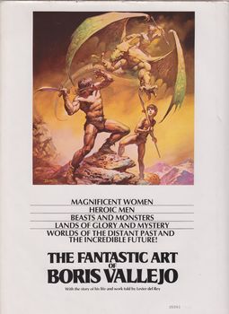 remarques: | English book with 40 colour paintings of Boris Vallejo some of them unpublished foreword by Lester del Rey - painting scenes derived from fantasy material is one of the most demanding challenges an artist can face, in most cases there are no living models of the characters and creatures with which fantasy deals - except perhaps in the case of a few best-sellers, it is the cover art which must sell a mass-market work of fiction - Vellajo is of Peruvian origin, he visited the Escuela Nacional de Bellas Artes (National School of Fine Arts) and then went to the States where he was shortly afterwards engaged by Marvel, he is now a free lance artist - some of his paintings have reached great fame by illustrating the covers of well-known books and comics such as Tarzan, Conan, Doc Savage and other fantasy fiction - his paintings are real pieces of art depicting magnificent women, heroic men, beasts and monds as well as worlds of glory and mistery - about the only area of fantasy wish-dreaming that Boris Vallejo seemd not to work in was the deep-space tale, with its emphasis on hardware, it seemed that his talent must be best suited for the depiction of living creatures, real or imaginary >> p. 6 a complete sequence of steps, Boris Vallejo takes to produce a painting best illustrations among the 40 paintings produced in the seventies: >> p. 23 the high couch of Silistra >> p. 25 demon in the mirror >> p. 27 Tarzan and the castaways >> p. 31 Tarzan, lord of the jungle >> p. 33 primeval princess (being the cover of this book) >> p. 39 Nubian warrior >> p. 57 the amazon's pet >> p. 67 Tarzan the untamed >> p. 69 gateways (painting of space tales, a spaceship) >> p. 77 through the reality warp >> p. 79 the secrets of synchronocity >> p. 85 the maker of universes >> p. 87 I am a barbarian >> p. 93 Tarnsman of Gor >>> one of the first books publishing the art of Boris Vallejo, here is the stuff of myths and visions, the kinds of primal image that exert a powerful pull on the readers and herein lies Vallejo's true gift, a gift that goes beyond mere technical virtuosity to strike a deep and responsive chord in all our imaginations with the rare talent to capture the essence of our dreams and fantasies enclosures - cover of the book, a primeval princess - the amazon's pet - Tarzan, lord of the jungle - I am a barbarian - the secrets of synchronocity |