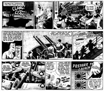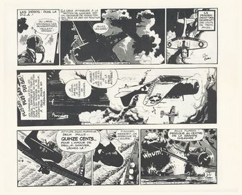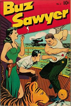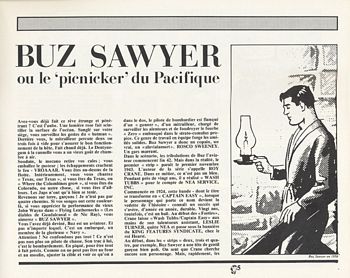 remarques: | volume 1 1943-1944, paraissant dans les daily comic strips, album cartonné, N&B, avec jaquette, format à l'italienne, faisant partie de la collection Futuropolis Copyright, album en 2 épisodes: flammes sur le Pacifique et le baiser du cobra Buz Sawyer est une série de bande dessinée créée par Roy Crane, elle est distribuée par la King Features Syndicate de 1943 au 1989, le 1er novembre 1943 paraît le strip numéro un de Buz Sawyer les aventures de ce brillant pilote de la navy démarrent sur le lancement d'un puissant porte-avion, le Tippecanoe, et se poursuivent tout au long de la guerre du Pacifique, Buz Sawyer était un pilote de bombardier en piqué et était accompagné de Rosco Sweeney, son mitrailleur arrière (the gunner), Buz Sawyer est impitoyable au combat mais il a un bon fond la bande de Buz Sawyer commença sa publication fin 1942 à la King Features Syndicate, propriété de Hearst, le magnat de la presse, dans cette série, Crane met l'accent sur une composition bien affirmée de dessins noir et blanc et auparavant Crane avait déjà réalisé la série de de Wash Tubbs (1924) à la NEA Service Press dont le titre deviendra un peu plus tard "captain easy", la dernière bande signée par Crane est daté du 21 avril 1979, petit résumé des extraits présentés dans l'album: Buz est engagé comme pilote sur le tout nouveau porte-avions "Tippecanoe", son avion porte le numéro 13 mais après plusieurs engagements, son avion sera abattu par un chasseur zero, lui et son co-pilote seront à la dérive plusieurs jours sur l'océan avant de s'échouer sur une île occupée par les japonais, ayant échappé aux japonais, Buz fera la connaissance d'April, la fille d'un colon allemand à la mort de son père, April les rejoindra sur un radeau fabriqué par Buz et Sweeny, un hydravion américain finira par les récupérer après avoir pris du repos, Buz Sawyer quittera April pour de nouvelles missions dans le Pacifique, avec Sweeny, il participe à la reconquête de nombreux îles, par la suite, il se verra confié une mission spéciale en déposant un agent secret néerlandais sur territoire ennemi en utilisant un avion japonais, son avion détruit à l'atterrissage, Buz accompagne l'agent secret, ce sera l'épisode du baiser de cobra, en l'occurrence un chef de guérilla qui se révèle être une femme à qui Buz administera une bonne fessée mais qui se sacrifiera pour Buz Sawyer >> un scénario respectable composé de récits de guerre mais avec un graphisme peu remarquable donnant toutefois un échantillon représentatif de la série information Granberry began writing Buz Sawyer during the 1940s, continuing as the strip's scripter until 1983, in 1946, 31-year-old Henry G. Schlensker, who had created Biff Baker with Ernest Lynn (1941–45), settled in Orlando, where he became Crane's art assistant, an ulcer resulted in Crane's retirement from the strip in the 1960s, but he continued to work closely with Granberry and Schlensker, after Crane's death in 1977, Schlensker began signing the strip, the duo continued as a team until 1983, when they retired, John Celardo drew the daily until it was discontinued on October 7, 1989, Schlensker, who fought with the Army Air Corps in East Asia during World War II, died in 1997 at the age of 82, he loved to draw, and he loved action, "that strip was his whole life," said his wife, Virginia Schlensker Rosco Sweeney, who was Sawyer's comic-relief sidekick, was the lead character of the Buz Sawyer Sunday strip, a comedy about rural and suburban life, Sweeney largely disappeared from the dailies after World War II, beginning in the late 1940s, Crane assigned the writing and drawing chores for the Sunday strip to cartoonist Clark Haas, who was a pioneer jet pilot, later, Al Wenzel did the Sunday strip, which Crane brought to a conclusion on May 19, 1974 family tree: - John Singer Sawyer alias Buz Sawyer, a navy pilot, - Christy Jameson, his fiancée, later wife (married December, 1948), - Pepper Sawyer, their son (born 1951) who was named for Edwin Granberry's great nephew, William R. "Pepper" Chalker - Peggy Sawyer, Buz's sister - Teddy Sawyer, alias Lucky Sawyer, Buz’s kid brother, musician |