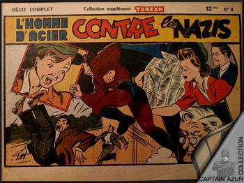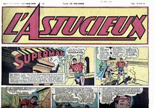 remarques: | volume 5 1944-1945 avec 3 épisodes: le sosie, fausse nouvelle et Loïs est riche a) le sosie (14 juillet 1944 au 28 octobre 1944) des extra-terrestres du royaume de Thymaung enlèvent Jimmy Olsen, coursier au Daily Planet, il est considéré comme le sosie de Rahma, l'enfant-roi de Thymaung qui est en désaccord avec son conseil et le conseil veut maintenant le remplacer par Jimmy Olsen, qui devrait être plus obéissant dans leur projet de gouverner le monde avec les gardes fidèles du petit roi, Superman neutralise les membres du conseil et délivre le petit roi, tenu captif dans une prison inviolable car fabriquée au railium et Superman devra user de ruse pour démolir les parois de la cellule b) fausse nouvelle (30 octobre 1944 au 2 décembre 1944) 1ère planche: la tournée de Superman à travers les Etats-Unis pour vendre des bons de la défense, "vos dollars seront comme des briques qui feront un mur que nos ennemis ne pourront franchir" Superman dixit à Métropolis, un journaliste propage la fausse nouvelle du mariage de Superman avec la riche héritière Aline Wail, Loïs Lane ne veut pas le croire >> p. 11/9 le merveilleux chapeau de Loïs mais le fiancé en question d'Aline Wail n'est pas du tout le vrai Superman et le vrai Superman viendra confondre le faux Superman > p. 11/21 les super pouvoirs de Superman mais même Superman n'a que deux mains! c) Loïs est riche (4 décembre 1944 au 10 février 1945) Loïs hérite de 3 millions de dollars (sur le papier) d'un grand oncle qui vient de décéder mais si Loïs n'est pas mariée dans les 10 prochains jours, son héritage lui échappera à cause d'une fuite au journal Daily Planet, tout Métropolis apprend que Loïs va faire un grand héritage si elle se marie de suite et Loïs est maintenant assaillie par de nombreux prétendants Loïs aurait aimé épouser Superman et un prétendant prend le rôle de Superman pour se faire prendre comme époux, la supercherie sera toutefois découverte par le vrai Superman et pour finir, Loïs ne trouvera pas de mari mais elle n'y perdra rien car son héritage est constitué de billes de banque 1896 de la république de San Oco qui n'ont plus aucune valeur! et Loïs continuera son job au Daily Planet >> des aventures un peu désolantes de Superman malgré ses super pouvoirs annexes - couverture et 4ème plat du tome 5 - 14 mai 1947 2ème année, nouvelle série numéro 1 de L’Astucieux - parution de Superman, sous forme de supplément au journal de Tarzan, édité par les éditions mondiales en 1947 |