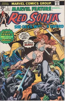 remarques: | English version, vol.1/No.1 November 1975, first issue, serie 2122 Red Sonja, the She-devil with a sword freely adapted from the story of Robert E. Howard - the temple of abomination by Roy Thomas+Dick Giordano - Red Sonja, of swords and she-devils n.b. this first issue is drawn by Giordano but the main part of Red Sonja's issues are drawn by artist Frank Thorne The origin of Red Sonja, "the Day of the Sword", first appeared in Kull and the Barbarians #3 by Roy Thomas, Doug Moench and Howard Chaykin and was later redrawn by Dick Giordano and Terry Austin for Savage Sword of Conan there have been 4 original series of Red Sonja edited by Marvel 1/ volume 1 nos 1-7, serie 2122 (november, 1975 – november, 1976) 2/ volume 1 nos1-15, serie 2945 (january, 1977 – may, 1979) 3/ volume 2 nos 1-2, serie 2035 (february, 1983 – March, 1983) 4/ volume 3 nos 1-13 (august, 1983 – may, 1986) Information a) Red Sonja is a fictional character, a sword-and-sorcery comic-book heroine created by writer Roy Thomas and artist Barry Windsor Smith for Marvel Comics in 1973, partially based on Robert E. Howard's own creation "Red Sonya of Rogatino" a female swashbuckler from his 1934 short story "the Shadow of the Vulture" and to a certain degree also based on Howard's character Dark Agnes de Chastillon Red Sonja debuted in Conan the Barbarian #23 (cover-dated Feb. 1973), Roy Thomas created a new origin story and transposed the timeline from the 16th century of Howard's original Red Sonya, to the Hyborian Age, another Howard creation, in order to have the comic-book Red Sonja interact with Conan the Barbarian, in 1975 Marvel Comics published the first issue of Red Sonja after the character headlined Marvel Feature for seven issues that same year at the 2013 Emerald City Comic Con, Dynamite, which began publishing Red Sonja comics in 2005, announced that Gail Simone would be writing a new ongoing Red Sonja series Simone noted in further interviews that her version is slightly "rebooted," showing the character's beginnings, Issue #1 of Simone's run was released in July 2013, and reviews were positive the series ran through 18 issues, in 2017, a new Red Sonja comic series began, written by Amy Chu, she was portrayed by Brigitte Nielsen in the 1985 film Red Sonja, in 2011, Sonja was ranked first in Comics Buyer's Guide's "100 sexiest women in Comics" list b) Red Sonja lived with her family in a humble home in the Western Hyrkanian steppes, when she had just turned 17 years old, a group of cruel mercenaries killed her father Ivor, her mother and two younger brothers and burned their house and all their possessions, she survived but at the cost of her own virginity after she was brutally raped by the leader of the group, leaving her in shame, after all this, the goddess Scathach then appeared to her, and instilled in her incredible skill in handling swords and other weapons on the condition that she would not allow herself to be loved by another man unless he defeated her in fair combat in her adventures, she often crossed path with Conan the Barbarian and the two were constant enemies of the evil sorcerer Kulan Gath. Red Sonja also went to the future on two separate occasions when she possessed Mary Jane Watson and teamed up with Spider-Man in defeating Kulan Gath who had also traveled to the future in one of many attempts to take over modern day Earth. a sword-master in peak human physical condition, martial arts expert, as well as knowledge and experience of fighting the supernatural |