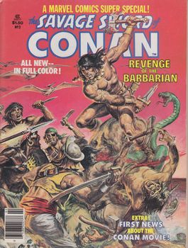 remarques: | vol. 1/No. 2 savage sword of Conan, reprint 1977 in colour of the original serie in black and white, cover painting by Earl Norem this number is part of Marvel Comics super Special serie with about 40 issues of different subjects 1/ part 1, revenge of the Barbarian by Roy Thomas and John Buscema+Alfredo Alcala 2/ part 2, skulls and arrows 3/ part 3, the slitherer in darkness 4/ short descriptions with photos of - Robert E. Howard - Roy Thomas - John Buscema - Alfredo Alcala and Marie Severin >> a reprint full-colour but the impression does not reflect the good quality of the original serie enclosures - super special no 2 with Conan - super special no 1 with the Kiss band Information Marvel Comics Super Special was a 41-issue series of one-shot comic-magazines published by Marvel Comics from 1977 to 1986, they were cover-priced $1.50 to $2.50, while regular color comics were priced 30 cents to 60 cents, beginning with issue #5, the series' title in its postal indicia was shortened to Marvel Super Special, covers featured the title or a variation, including Marvel Super Special, Marvel Super Special magazine, and Marvel Weirdworld Super Special in small type, accompanied by large logos of its respective features these included, primarily, film and TV series adaptations, but also original and licensed Marvel characters, and music-related biographies and fictional adventures. issue #7 was withdrawn after completion, and never published, issue #8 was published in two editorially identical editions, one magazine-sized, one tabloid-sized |