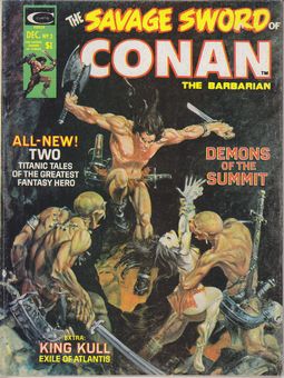 remarques: | Savage sword no 3, serie 2929, December 1974 cover Mike Kaluta 1/ Conan, at the mountain of the moon-god by Roy Thomas and John Buscema part II, when dark death soars 2/ chronicles of the Sword by Glenn Lord, the first barbarian, king Kull 3/ Blackmark, episode 3 by Gil Kane 4/ Kull of Atlantis, quotations from the story "exile of Atlantis" by Howard, by Roy Thomas and Barry Smith 5/ Conan, the demons of the summit by Roy Thomas and Tony de Zuniga |