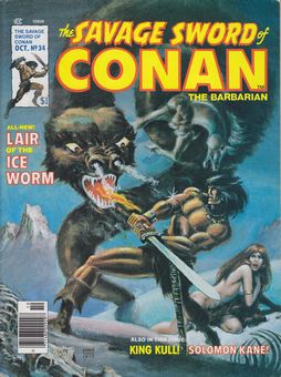 remarques: | Savage Sword no 34, serie 2929, October 1978 cover Ernie Chan (not the best cover of EC) 1/ Conan, the lair of the ice worm by Roy Thomas and Carmine Infantino+Alfredo Alcala part 2) the nest of the ice worm 2/ Solom Kane, moon of skulls by Don Glut and David Wenzel 3/ daily and sunday strips of Conan 4/ King Kull, the mirrors of Tuzon Thune by Roy Thomas and Mike Ploog |