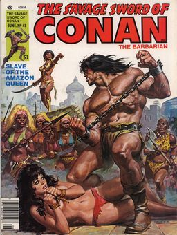 remarques: | Savage Sword no 41, serie 2929, June 1979 cover Earl Norem 1/ Conan, the quest for the cobra crown by Roy Thomas and John Buscema+Tony Dezuniga part 2) the city of the amazons n.b. the stories of Conan include usually a map whowing where the action takes place 2/ Conan's world, the ballad of Bêlit by Roy Thomas 3/ Solomon Kane, the return of sir Richard Grenville by Roy Thomas and David Wenzel |