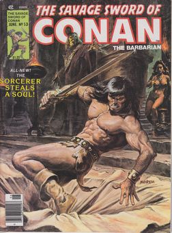 remarques: | Savage Sword no 53, serie 2929, June 1980 cover Earl Norem 1/ Conan, the sorcerer and the soul by Roy Thomas and John Buscema+D. Nebres part 2) at the keep of Hisarr Zul 2/ Solomon Kane, wings in the night by Don Glut and David Wenzel |