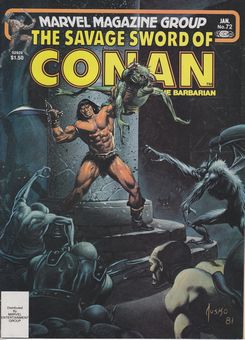 remarques: | Savage Sword no 72, serie 2929, January 1982 cover Joe Jusko 1/ Conan, the colossus of Shem, the colossus being a giant tortoise by Bruce Jones and Ernie Chan 2/ portraits of Conan by various artists n.b. this issue includes an original panel drawn by Ernie Chan showing the giant tortoise |