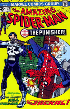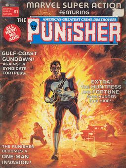 remarques: | the Punisher appeared first in issue no 129 of Amazing Spider-Man, it appeared also in the serie Marvel Preview and Marvel made the experiment to bring the Punisher as a character sustaining a magazine on his own, however it seems that Marvel Super Action featuring the Punisher vol.1/ No. 1 January 1976 was the only one-shot issue, there were afterwards a serie of Super Action vol. 2 with 37 issues but it was no longer linked with the Punisher and featuring Super Action the Avengers (1980) black and white, 76 pages, 1 $ therefore the Punisher vol. 1/ No. 1 is a one-shot rare issue which is reflected in the price it is dealt with 1/ The Punisher, America's greatest crime destroyer, "accounts settled.. accounts due..." a gundown against a syndicate (mafia) fortress by Archie Goodwin and Tony Dezuniga 2/ the huntress, red-eyed Jack is wild by Mike Friedrich and George Evans+Frank Springer 3/ Tyndall of Klarn, an ugly mirror on weirdworld a mix of humour and heroic-fantasy story by Doug Moench and art by Mike Ploog 4/ Dominic Fortune, the messiah in the saddle resolution, a king of dr Justice in the name of God (1936) story and art by Howard Chaykin enclosures - cover of volume 1/no 1 January 1976 - cover of Amazing Spider-Man no 129 February 1974 Information The Punisher (Francis "Frank" Castle, born Castiglione) is a fictional character appearing in American comic books published by Marvel Comics, the character was created by writer Gerry Conway and artists John Romita Sr. and Ross Andru, with publisher Stan Lee green-lighting the name, the Punisher made his first appearance in The Amazing Spider-Man #129 (cover-dated Feb. 1974) the character is a vigilante who employs murder, kidnapping, extortion, coercion, threats of violence, and torture in his campaign against crime, driven by the deaths of his wife and two children who were killed by the mob for witnessing a killing in New York City's Central Park, the Punisher wages a one-man war on the mob and all criminals and employs the use of various firearms his family's killers were the first to be slain by the Punisher a war veteran and a United States Marine Corps Scout Sniper, Castle is skilled in hand-to-hand combat, guerrilla warfare, and marksmanship the Punisher's brutal nature and willingness to kill made him a novel character in mainstream American comic books when he debuted in 1974, by the late 1980s, the Punisher was part of a wave of psychologically-troubled antiheroes, at the height of his popularity, the character was featured in four monthly publications, including the Punisher, the Punisher war journal, the Punisher war zone, and the Punisher armory, despite his violent actions and dark nature, the Punisher has enjoyed some mainstream success on television, making guest appearances on Spider-Man: the Animated Series, and the Super Hero Squad Show, where the depiction of his violent behavior was toned down for family viewers, in feature films, Dolph Lundgren portrayed the Punisher in 1989, as did Thomas Jane in 2004, and Ray Stevenson in 2008, Jon Bernthal portrays the character in the second season of Marvel's Daredevil as a part of the Marvel Cinematic Universe, Bernthal reprised the role in The Punisher, his own self-titled series the Punisher was conceived of by Gerry Conway, writer of the Amazing Spider-Man, who helped design the character's distinctive costume, as Conway recalled in 2002, that, "in the 70s, when I was writing comics at DC and Marvel, I made it a practice to sketch my own ideas for the costumes of new characters—heroes and villains which I offered to the artists as a crude suggestion representing the image I had in mind, I had done that with the Punisher at Marvel" Conway had drawn a character with a small death's head skull on one breast Marvel art director John Romita, Sr., took the basic design, blew the skull up to huge size, taking up most of the character's chest Amazing Spider-Man penciller Ross Andru was the first artist to draw the character for publication appearing for the first time in the Amazing Spider-Man #129 (Feb. 1974), the Punisher was initially an antagonist of the titular hero, he is portrayed as a bloodthirsty vigilante who has no qualms about killing gangsters, something that most superheroes of the time refrain from doing, J. Jonah Jameson describes him as "the most newsworthy thing to happen to New York since Boss Tweed", in this appearance, the Punisher is determined to kill Spider-Man, who is wanted for the apparent murder of Norman Osborn, the Punisher is shown as a formidable fighter, skilled marksman and able strategist, all he reveals about himself is that he is a former U.S. Marine, he has a fierce temper but also shows signs of considerable frustration over his self-appointed role of killer vigilante, he is engaged in extensive soul-searching as to what is the right thing to do: although he has few qualms about killing, he is outraged when his then-associate, the Jackal, apparently kills Spider-Man by treacherous means rather than in honorable combat, Spider-Man, who is himself no stranger to such torment, concludes that the Punisher's problems made his own seem like a "birthday party" the Punisher is the recipient of multi-disciplinary military training from the United States Marine Corps, United States Marine Corps Force Reconnaissance, while a Marine, he also received training from the Airborne School and U.S. Navy Seals as well as cross-training with the Australian Special Air Service Regiment during the Vietnam War, in addition, since beginning his work as the Punisher, Castle has used his military discipline and training techniques to update and expand his skills in areas that aid in his mission (disguise, acting, use of non-military weapons, etc.), from this training, Punisher is proficient in not only basic infantry skills, but in special operations, which includes the use and maintenance of specialized firearms and explosive ordnance, he is highly t