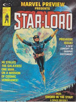 remarques: | Peter Quill (colloquial: Star-Lord) is a fictional superhero appearing in American comic books published by Marvel Comics, the character, created by Steve Englehart and Steve Gan, first appeared in Marvel Preview #4 (January 1976), the son of human Meredith Quill and Spartoi J'son, Peter Quill assumes the mantle of Star-Lord, an interplanetary policeman Star-Lord, heroic fantasy in the far-flung future, a man who stalks the galaxies on a mission of cosmic vengeance Marvel Preview no 4, serie 2928, January 1976 cover Gray Morrow 1/ Star-Lord, first house: earth the opening chapter in the chronicles of Star-Lord as he lashes out against the grim alien menace that destroyed his past and determined his future 2/ sword in the star, dissertation based on certain ancient stories such as the epics of Homer and other myths and legends 3/ the sword in the star, stave 1 : alas, the seeds of man by Bill Mantlo and Ed Hannigan Information Star-Lord is a master strategist and problem solver who is an expert in close-quarter combat, various human and alien firearms and battle techniques, he has extensive knowledge of various alien customs, societies, and cultures, and considerable knowledge about cosmic abstracts, such as oOblivion as Star-Lord, Peter Quill wears a suit that grants augmented strength and durability and the ability to travel through space the character uses an "Element Gun", a special meta-pistol capable of projecting one of the four elements (air, earth, fire and water), Star-Lord shares a psychic link with his sentient space vessel, "Ship", "Ship" is actually a sentient energy form, she most often exists in the form of a starship, but can alter her structure at will, she can travel through air, space and water, she possesses many of the conventional starship accessories, including shields, energy blasters, advanced sensors, replicators (able to form any kind of food, drink, etc.), and hologram projectors she has proven capable of creating a human form which she can then animate and use as a host, even if completely destroyed, she is capable of restoring herself, since her true form is her consciousness, in addition, she takes on a number of feminine characteristics, such as a mothering instinct for those she is partnered with, she has felt deeper attachments, including love for her partners "Ship" can create widgets—small, mobile droids able to scout out situations, gather information and then return to her, the full extent of "Ship's" abilities are unknown during Star-Lord's battle with the Fallen One, his element gun, suit and "Ship" were destroyed, due to severe injury he was grafted with cybernetic implants by doctors on the Kyln where he was sentenced, the eye implant allows him to see all energy spectra and the memory chip in his brain gives him 100% total recall on the Kree world of Aladon Prime, Star-Lord's cybernetic implants were removed, Star-Lord was outfitted with a Kree-issued heat-dampening espionage battle-suit, which became the hallmark look for the Guardians of the Galaxy, a battle helmet and a universal translator, all of which he still uses, his battle helmet can analyze strategy data, improve vision, and regulate oxygen in space Star-Lord's chosen weapons are two Kree sub-machine guns with various types of ammunition, including explosives after escaping the Cancerverse, Peter acquires a new element gun(s), but discards his armor |