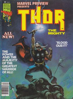 remarques: | Marvel Preview no 10, serie 2928, winter 1977 cover Jim Starlin 1/ Thor the mighty, the blood quest the most spectacular quest begins as Almighty Odin dispatches his two sons Thor the mighty and his treacherous half-brother Loki in search of the deadly crystal of blood confronted by the Ultimate Guardian by Len Wein and Jim Starlin+Tony Dezuniga 2/ Hercules the prince of power, the isle of fear by Bill Mantlo and Val Mayerik |