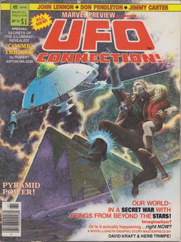 remarques: | Marvel Preview no 13, serie 2928, winter 1978 cover Jim Starlin 1/ the UFO connection, part one by David Kraft and Herb Trimpe 2/ the UFO connection, special report with two major witnesses: a) by Jimmy Carter in 1969 "obviously there, obviously unidentified" b) by John Lennon's, ex-Beatle " a close encounter" + some scientific explanations for UFO and/or extra-terrestrial appearances: a) the Bell's theorem with three submodels 1) the observer-created universe 2) parallel universes 3) information-without-energy b) some human beings of highly evolved psychic powers (being called the Illuminati) are playing head-games with other human beings, sometimes passing themselves off c) we really are being contacted, experimented upon or otherwise manipulated by higher intelligences from outer space, probably from Sirius (or the Illuminati are creating a simulation of such extraterrestrials) d) we have always shared this planet with another intelligent species, which can either remain invisible or manifest to us in any form it chooses (ultra-terrestrials n.b. earlier ages called them fairies, angels, demons, etc e) we are all evolving into the use of new neurological circuits which will make us superhuman in comparison to our present average state f) a combination or permutation of the above (multi-theory approach >> see also the documentation about the project "blue book", a special report made in 1948 3/ the UFO connection, part two >> an issue wholly dedicated to the UFO topic |