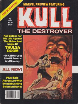 remarques: | Marvel Preview no 19, serie 2928, summer 1979 cover Bob Larkin n.b. detailed commentary on king Kull >> see Kull barbarian king no 1 Kull and the Barbarians 1/ king Kull, riders beyond the sunrise Kull rides into the mystic east a battle against the malevolent magic of Thulsa Doom by Roy Thomas and Sal Buscema+Tony Dezuniga part 2) beyond the river of the death (of no return) 2/ king Kull, the tiger of Atlantis a comics chronology of the violent career of King Kull of Valusia, from the Thurian chronicles 1/ exile, 2/ rise to kingship, 3/ the adventurer 4/ dethroned, 5/ return to Atlantis, 6/ quest for a crown, 7/ a king once more 8/ Kull meets Conan 9/ Kull's last ride 3/ a portfolio of King Kull by Marie and John Severin 4/ the legend of Solomon Kane he was a danger-seeking Puritan adventurer in the England of Queen Elizabeth I around 1530, a tale of Solomon Kane: the footfalls within by Don Glut and Will Meugniot+Steve Ganu |