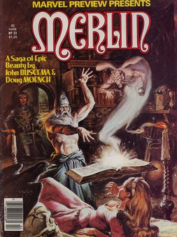 remarques: | Marvel Preview no 22, serie 2928, summer 1980 cover Earl Norem 1/ Merlin the wizard, companion of Arthur Rex, the beloved king of England, noble lord of the round table at the castle of Camelot "quest of the king" script by Doug Moench+John Buscema and art by John Buscema+Tom Palmer 2/ the Ages of Arthur by Bill Mantlo Arthurian romance 3/ looking for the real Arthur in History of the kings of Britain (1136) which is the first source to connect him with ideals of chivalry by Steven Grant |
