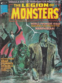 remarques: | this first issue "the legion of monsters" was a one-shot publication by Marvel Comics under serie 2447 dated September 1975, however the title is featuring again under Marvel Preview No. 8 (1976) black and white, 76 pages, 1 $ legion of monsters, serie 2447, no 1, september 1975 cover Neal Adams 1/ Frankenstein monster, the monster and the masque it was a jolly old costume party until the arrival of two uninvited guests by Doug Moench and Val Mayerik 2/ the manphibian, vengeance crude he came from beyond the stars, seeking revenge on the murderer who had shattered his life by Marv Wolfman and Dave Cockrum 3/ the flies, they called him Chuckles and they laughed at him by Gerry Conway and Paul Kirschner 4/ Bram Stoker's Dracula, death, be thou proud a man-demon stalks London 5/ monster gallery by various artists Information the Legion of Monsters first appeared in Marvel Comics chronology in Marvel Premiere #28 and were created by Bill Mantlo, Frank Robbins, and Steve Gan. a similar team appeared in a one-shot anthology Curtis magazine, Legion of Monsters #1, in September 1975, pre-dating Marvel Premiere #28 by five months, the line-up was almost identical; Ghost Rider was not present, but the magazine included Frankenstein's Monster, Dracula, Werewolf by Night, Manphibian, Man-Thing, and Morbius, the Living Vampire, the story continued in Marvel Preview #8. the first version of the Legion of Monsters were united by chance to investigate the appearance of a strange being called the Starseed, athough the being was benevolent, Morbius, the Living Vampire and Werewolf by Night were overcome by their hungers and attacked it, Ghost Rider intervened as the Starseed was unable to overcome his fear of Man-Thing and was burned by it, the dying Starseed attempted to cure the Legion of their monstrous forms, but was too weak and died minutes later, tired of fighting and disappointed in their actions the team split up, although they barely even acknowledged being a team in the first place |