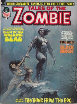 remarques: | a serie of 10 issues (1973-1975) >> see information, black and white, 76 pages, 75 cents only the first seven issues are collected here with the logo Marvel Monster Group on the cover Tales of the Zombie no 1, serie 2189, 1973 cover Boris Vallejo 1/ Zombie, the alter of the damned, Simon Garth, the zombie, the living-dead with the zombie girl Leyla by Steve Gerber and John Buscema part two, Zombie, a man without soul 2/ Iron-head by Dick Ayers 3/ the Thing from the bog (= mystic waters) by Marv Wolfman and Pablo Marcos 4/ Mastermind, a Marvel mini-monsterpiece 5/ the night of the walking dead by Steve Gerber and John Buscema Information Tales of the Zombie was an American black-and-white horror comics magazine published by Magazine Management, a corporate sibling of Marvel Comics, the series ran 10 issues and one annual publication from 1973 to 1975, many featuring stories of the zombie Simon Garth by writer Steve Gerber and artist Pablo Marcos a magazine rather than a comic book, it did not fall under the purview of the comics industry's self-censorship Comics Code Authority, allowing the title to feature stronger content — such as moderate profanity, partial nudity, and more graphic violence — than color comics of the time. copyrighted as simply Zombie and commonly known by its trademarked cover title, Tales of the Zombie, the magazine ran 10 issues cover-dated 1973 to March 1975, with sister titles including Dracula Lives, Monsters Unleashed and Vampire Tales, it was published by Marvel Comics' parent company, Magazine Management and related corporations, under the brand emblem Marvel Monster Group to star in the new title, Marvel's then-editor-in-chief Roy Thomas plucked Simon Garth, a character from a standalone, 1950s horror tale created by Stan Lee and Bill Everett, introduced in Marvel predecessor Atlas Comics' Menace #5 (July 1953), this was a story published prior to the comics industry's self-censorship Comics Code Authority, which among other strictures forbade zombies, this seven-page story was reprinted in Tales of the Zombie #1 (with the art slightly altered to give Simon Garth shoulder-length rather than short hair) as the continuation of a new, 12-page prequel story co-scripted by Thomas and Steve Gerber and drawn by John Buscema and Tom Palmer following the premiere, all the Zombie stories were by Gerber and artist Pablo Marcos (one of these in collaboration with writer Doug Moench and artist Alfredo Alcala), the original series' finale, set at Garth's daughter's wedding in issue #9, was a three-chapter story written by Tony Isabella (chapter 2 with co-scripter Chris Claremont), drawn by pencilers Virgilio Redondo, Yong Montano, and Ron Wilson, respectively, and inker by Alcala (chapters 1-2) and Marcos (chapter 3), Simon Garth was laid to peaceful rest in Tales of the Zombie #9; the following, final issue contained a Brother Voodoo story and three anthological tales (Brother Voodoo also appeared in a backup feature in issue #6.) in addition to reprinting the original 1950s Simon Garth story, the magazine reprinted other pre-Comics Code stories, including work by artists Win Mortimer and Tony DiPreta, painted covers to the series were done by artists including Boris Vallejo and Earl Norem an annual publication formally titled Tales of the Zombie Annual was published in 1975, reprinting stories from the magazine |