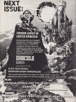 remarques: | Dracula lives no 5, serie 2187, March 1974 erroneously mentioned volume 2/ number 1 cover Luis Dominguez 1/ Dracula, the origin adapted from the novel of Bram Stoker, Dracula's tales of terror by Roy Thomas and Dick Giordano 2/ Dracula against Cagliostro, a duel of demons by Gerry Conway and Frank Springer 3/ a double page, demons in darkness by Pablo Marcos 4/ when a vampire dies 5/ Dracula, a night flight to terror by Tony Isabella and Gene Colan+Pablo Marcos |