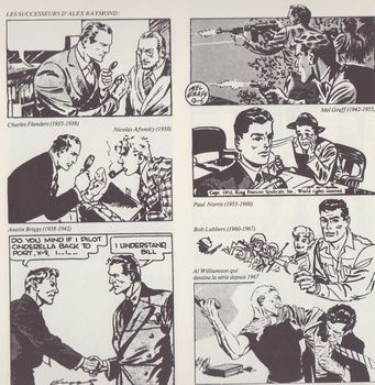 remarques: | préface sur Alex Raymond ou le diable dans sa boite différence entre les planches et les strips (daily strip = petits casses-cinémas qui défilent au jour le jour), entretemps Hammett a cessé d'écrire les scenarios qui sont repris avec le graphisme par Raymond début de l'âge d'or du film noir avec le "le faucon maltais", "scarface" et "little Caesar" ainsi que les films du dr Mabuse par Fritz Lang si Flash Gordon est de composition picturale, X-9 est d'inspiration esthétique cinématographique tout en gardant le sentiment de vélocité et de violence les épisodes du volume 2: 1) la voiture en flammes (the torch car case) du 11.3.1935 au 20.4.1935 X-9 en prise avec des faux-monnayeurs dirigés par Big Hat, arrivée du gros Sydney George Harper Carp sensé s'occuper des affaires juridiques de X-9, dans cet épisode, le constraste noir et blanc est moins prononcé 2) la disparition de Philip Shaw (the missing of Philip Shaw) du 22.4.1935 au 27.7.1935 l'affaire du jeune Shaw qui est enlevé par la bande de Griffe d'Acier pour lui soutirer les plans où se trouvent des puits de pétrole au Texas, après de nombreux péripéties, X-9 délivre le jeune Shaw et résoudra le mystère du testament de Shaw >> pl. 7.6 les gangsters disposent même de canons anti-aériens >> pl. 7.16 le magnifique costard de X-9 le graphisme est toujours bon mais peut'être un peu plus relâché 3) les joyaux égyptiens (the Egyptian jewel case) du 29.7.1935 au 21.9.1935 la bande Maroni s'intéresse aux joyaux du prince Abdallah, X-9 retrouvera les voleurs et la belle princesse pourra à nouveau porter ses joyaux étincelants > pl. 8.1 la femme de chambre de la princesse Sheila 4) le corrupteur (the fixer) du 23.9.1935 au 16.11.1935 sur la piste du criminel nommé le corrupteur, X-9 est aussi chargé de la protection de deux témoins à charge, X-9 se fera passer pour un gangster afin de mieux pouvoir parvenir jusqu'au corrupteur qu'il démasquera à l'aide d'un dictographe n.b. dictographe = dispositif d'écoute secrète, souvent un microphone >> pl. 9.6 le gagnant du concours de beauté >> pl. 10.12 les complices du corrupteur: Annie la française et Hammil le bossu aveugle 5) l'avion fantôme (the phantom plane) du 18.11.1935 au 11.1.1936 chaque fois qu'un avion non-identifié (l'avion fantôme) passe sur l'aéroport de Woodford, il y a un accident mortel et les avions d'un industriel sont sabotés, le coupable est découvert, c'est le concurrent du constructeur aéronautique Campbell >> pl. 12.3 le fusil fantôme dernière planche: petite erreur du scenariste: le fiancé est Jimmy chéri et non Roy chéri >> un album de collection, le scenario est fait rapidement (quick-strip) et plutôt naïf, mais le graphisme de Raymond reste de très bonne qualité annexes - couverture et 4ème plat de l'album - les nombreux dessinateurs de la série (successeurs de Raymond): - Charles Flanders (1935-1938), - Nicholas Afonsky (1938), - Austin Briggs (1938-1942), - Mel Graff (1942-1955), - Paul Norris (1955-1960), - Bob Lubbers (1960-1967), - Al Williamson et Dan Barry (dès 1967) |
