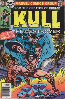 remarques: | after a break of 2 years since August 1974 no 15 Kull the destroyer is reprinting at no 16, August 1976, titled the tiger in the moon the reason is not quite clear (due to diminished sales or the departure of some artists?) however the writer has changed from Steve Englehart to co-authors Roy Thomas and Doug Moench with new artist Ed Hannigan, the cover as well has shown some minor change but not to its advantage |