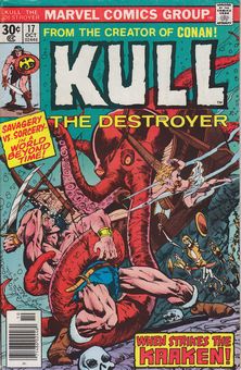 remarques: | Kull the destroyer no 17, serie 2446, October 1976 the price has increased from 25 cent to 30 cent what is not quite justified title: the thing from emerald darkness or when strikes the kraken by Doug Moench and Alfredo Alcala+Ed Hannigan |