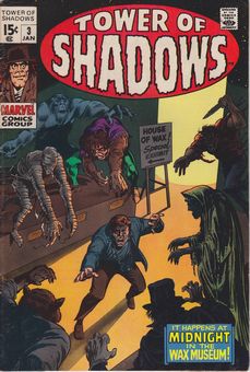 remarques: | Tower of Shadows no 3, serie 2124, January 1970 1/ the moving finger writhes by Len Wein and Gene Colan 2/ midnight in the wax museum by Gary Friedrich and George Tuska 3/ the terrible old man by Roy Thomas and Barry Smith |