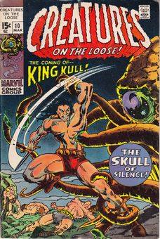 remarques: | continued from Tower of Shadows issue 9, the serie started out as a comic with reprint stories of horror and monster comics, but from issue 16 and on became the home for Marvel stars such as Gullivar Jones, Thongor and Man-Wolf retitled Thongor, warrior of lost Lemura as per no 22 serie of 12 issues (no 10 March 1971 to no 21 January 1973) the numbers 11 to 14 (4 issues are missing in this collection) Creatures on the loose, no 10, serie 2480, March 1971 1/ the skull of silence with King Kull by Roy Thomas and Bernie Wrightson 2/ Trull, the unhuman (an alien) parts one and two by Kirby+Ayers Information retitled Creatures on the Loose with issue #10 (March 1971), this version led off with a seven-page King Kull story by Thomas and artist Bernie Wrightson, the book included new stories by artists Herb Trimpe in #11, Syd Shores in #12, and Reed Crandall in #13, then became all-reprint until issue #16 (March 1972), when writer Thomas and the art team of Gil Kane and Bill Everett introduced the series "Gullivar Jones, warrior of Mars", starring an interplanetary earthman created by author Edwin L. Arnold in his 1905 book Lieut. Gullivar Jones: his vacation. following another issue by Thomas and one by Gerry Conway, science fiction novelist George Alec Effinger wrote the final three installments Effinger continued as writer for the series that immediately followed, in issue #22 (March 1973): "Thongor! warrior of Lost Lemuria", adapting a sword-and-sorcery barbarian character created by author Lin Carter, following writers Tony Isabella and Gardner Fox, Carter himself co-wrote (with Steve Gerber) the final two installments Thomas, Marvel's associate editor at the time, recalled in 2007 that Thongor had been the company's first choice when Marvel decided to publish a licensed fantasy character, rather than the eventual hit Conan the Barbarian, publisher Martin Goodman authorized us to go after a character, "I first went after Lin Carter's Thongor, who was a quasi-Conan with elements of John Carter of Mars, partly because editor-in-chief Stan Lee liked that name the most, I soon got stalled by Lin Carter's agent on Thongor (he was hoping I'd offer more than the $150 per issue I was authorized to offer), and I got a sudden impulse to go after Conan" the title's last series, "Man-Wolf", starred John Jameson, the werewolf son of Spider-Man supporting character J. Jonah Jameson, it ran from issue #30-37 (July 1974 -Sept. 1975), Its writers were Doug Moench, Isabella, and David Anthony Kraft, with art by pencilers George Tuska and George Pérez, the serie depicted Jameson as a god to an alien race, the serie was finally finished years later in Marvel Premiere #45-46 (December 1978 and February 1979). |