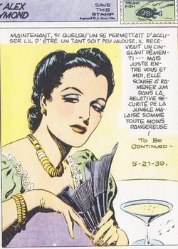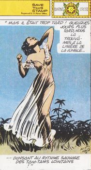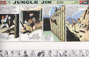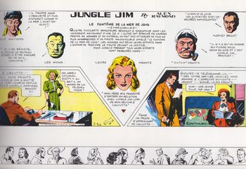 remarques: | 1) préface de Pierre Strinati l'aventure exotique dans les années 30, les récits d'aventure remplacent les récits d'exploration (qui sont pratiquement terminés en 1911 par la conquête du pôle sud) et premier film de ce genre avec le film "Shangai express" en 1932 de Sternberg qui influençera probablement Alex Raymond pour "Jungle Jim" dans la BD, les précurseurs des récits d'aventure sont "Wash Tubbs", "Terry et les pirates", "the Phantom" et "Jungle Jim" avec la belle aventurière Lil (Jim la jungle et Lil de Vrille en français) ainsi que "Tim Tyler's Luck" et "Tarzan of the Apes"(1930) 2) Shangai Lil par Claude Forest le détective de la jungle: Jim Bradley alias Jungle Jim qui a été découvert en 1943 par Forest grâce à d'ancien numéros diffusés par les messageries Hachette et suite au vieillissement des séries américaines qui s'amorçaient dans les dernières années de guerre surtout de par l'appauvrissement des scénarios, meilleure épisode selon Forest: la montagne sacrée de par les démêlés de Jungle Jim avec sa concurrente Shangai Lil 3) 1er épisode: le fantôme de la mer de Java (20.3.1938-7.8.1938) lutte contre la piraterie avec Shangai Lil, sa complice, et Kolu, assistant indien de Jungle Jim, aventures dans la jungle de Borneo pour découvrir le repaire du pirate qui se fait appeler le "fantôme de la mer de Java" 4) 2ème épisode: le tyran des îles Paguan (14.8.1938-21.5.1939) chasse au tigre avec Shangai Lil, puis nouvelle mission pour Jungle Jim: arrêter l'aventurier Karnak qui veut devenir le dictateur des îles Paguan, lutte contre les chasseurs de tête et élimination de Karnak >> p. 62 des souliers à hauts talons dans la jungle >> p. 63 de vrais débris humains 5) 3ème épisode: les adorateurs de la lune (28.5.1939-3.12.1939) histoire de Stacey, le planteur dont la femme est frappée de la folie de la jungle >> p. 73 jolie figure érotique la femme de Stacey s'est enfuie dans la jungle et Jungle Jim avec Shangai Lil doivent la récupérer, elle sera retrouvée chez les adorateurs de la lune qui veulent l'immoler à la déesse lune, après l'avoir délivrée des immolateurs et de l'envoûtement de la vieille sorcière Nala qui a provoqué sa folie, la femme de Stacey sera retournée à son mari >> un album mythique (réédition de l'album Slatkine 1983 en couleur) et le seul album de qualité publié sur la série de Jungle Jim, si le graphisme est de bonne fracture (bien que le N&B de Raymond convienne peut'être mieux à ce genre de dessin), le scénario n'est pas très recherché et comporte beaucoup de mièvrerie |