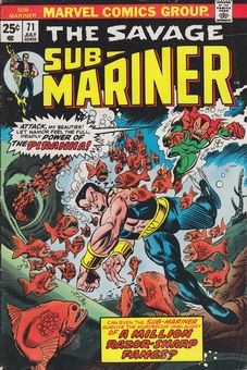 remarques: | there are numerous comic issues about the Sub-Mariner this number 71 presented here as a representative sample of the various series being part of the well-known serie starting with No. 1 May 1968 up to no 72 september 1974 the savage sub-mariner no 71, serie 2455, July 1974 1/ Prince Namor, the Sub-Mariner comes the piranha with razor-sharp teeth by Marv Wolfman and George Tuska Enclosures cover Sub-Mariner no 71 July 1974 cover Sub-Mariner no 1 May 1968 Information Namor the Sub-Mariner is a fictional character appearing in American comic books published by Marvel Comics, debuting in early 1939, the character was created by writer-artist Bill Everett for Funnies Inc., one of the first "packagers" in the early days of comic books that supplied comics on demand to publishers looking to enter the new medium, initially created for the unreleased comic Motion Picture Funnies Weekly, the Sub-Mariner first appeared publicly in Marvel Comics #1 (cover-dated Oct. 1939), the first comic book from Timely Comics, the 1930s–1940s predecessor of the company Marvel Comics, during that period, known to historians and fans as the Golden Age of Comic Books, the Sub-Mariner was one of Timely's top three characters, along with Captain America and the original Human Torch, Everett said the character's name was inspired by Samuel Taylor Coleridge's poem, "the Rime of the Ancient Mariner" Everett came up with "Namor" by writing down noble sounding names backwards and thought Roman/Namor looked the best the mutant son of a human sea captain and a princess of the mythical undersea kingdom of Atlantis, Namor possesses the super-strength and aquatic abilities of the Homo mermanus race, as well as the mutant ability of flight, along with other superhuman powers, through the years, he has been portrayed as an antihero alternately from a good-natured but short-fused superhero, or a hostile invader seeking vengeance for perceived wrongs that misguided surface-dwellers committed against his kingdom, the first known comic book antihero, the Sub-Mariner has remained a historically important and relatively popular Marvel character, he has served directly with the Avengers, the Fantastic Four, the Invaders, the Defenders, the X-Men, and the Illuminati as well as serving as a foil to them on occasion |