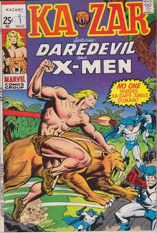 remarques: | commentary about Ka-Zar, see Ka-Zar no 6 damnation plague this first full color issue of Marvel's Ka-Zar No. 1 dated August 1970 mention in fact one of the first appearance of Ka-Zar, lord of the jungle with Zabu his saber-tooth tiger and Kazar fighting along with the X-Men against a tribe of Ape-Men led by Maa-Gor 1/ the episode is titled the coming of Ka-Zar by Stan Lee and Jack Kirby d >> but the illustration is not of very good quality 2/ Herkules, son of Zeus being chased in his footsteps by the Huntsman of Zeus mythological story by Stan Lee and Allyn Brodsky >> again not a first-class comic 3/ Daredevil, the man without fear in the mystery of the midnight stalker featuring also Ka-Zar as his companion by Stan Lee and Gene Colan this episode is probably the best one of the issue relating to the illustration |