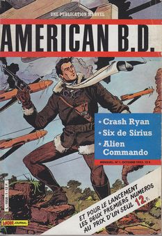 remarques: | American B.D. est une revue de l'éditeur Aventures & Voyages (Mon Journal) 6 numéros d'octobre 1985 à février 1986, 84 pages au format comics grand format et couleurs, cette revue a adapté du matériel Marvel relevant de la SF et non du super-héros, on retrouve ainsi les séries "6 de Sirius", "Alien Commando", "Crash Ryan" puis "le Dragon Noir" malheureusement le succès n'est pas au rendez-vous et la revue s'arrête après 6 numéros seulement. les 2 premiers numéros sont regroupés dans un numéro double, genre reliure no 1 octobre 1985, 50% couleur, 50% N&B - six de Sirius, 1er épisode by Doug Moench et Paul Gulacy - alien commando, objectif survie by Carl Potts - Crash Ryan, pilote du futur by Ron Harris no 2 octobre 1985 reprend principalement les mêmes bandes que le no 1 >> assez bonnes bandes de science-fiction, particulièrement celles de Crash Ryan |