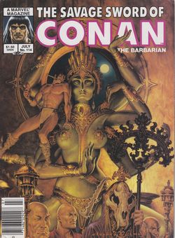 remarques: | Savage Sword no 114, serie 2929, July 1985 cover Steve Hickman 1/ Conan, the riddle of the Demuzaar by Larry Yakata and Rudy Nebres 2/ Conan, the toll by Don Kraar and Andy Kubert |
