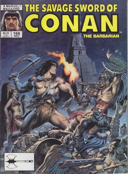 remarques: | Savage Sword no 166, November 1989 cover Earl Norem 1/ Conan, the blood of brothers beginning of a Conan's trilogy by Gerry Conway and Mike Docherty+Gary Kwapisz |