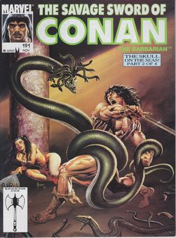 remarques: | Savage Sword no 191, November 1991 cover Joe Jusko 1/ Conan, the skull on the seas part 2) by Roy Thomas and John Buscema+Ernie Chan n.b. Conan got a mascotte, a little monkey, named EE-Ch'ing 2/ Kull, death and life in tiger valley part 2) by Roy Thomas and E.R. Cruz |