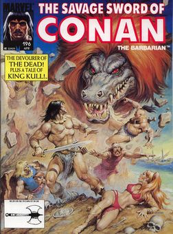 remarques: | Savage Sword no 196, serie 2929, April 1992 cover Earl Norem 1/ Conan, the devourer of the dead by Roy Thomas and Ernie Chan 2/ Kull, bride of the buccaneer another story of young Kull of Atlantis by Roy Thomas and E.R.Cruz |