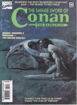 remarques: | Savage Sword no 211, July 1993 cover George Pratt 1/ Conan, the gods above, the beasts below demons, diamonds and dinosaurs, all of them by Roy Thomas and Rafael Kayanan n.b. beginning the most requested Conan tale ever: the sequel to red nails ( a sequel is a literature, film, theatre, television, music or video game that continues the story of, or expands upon, some earlier work 2/ Conan, the god of thieves by James Rose and Ernie Chan |