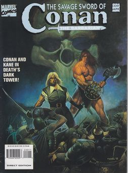 remarques: | Savage Sword no 220, April 1994 cover Colin MacNeil n.b. the decline in quality in respect of Savage Sword of Conan in now complete, the further issues are not of great interest, even some critics are brought forward by readers in swords and scrolls letters section of the magazine 1/ Conan, death's dark tower Conan and Salomon Kane battle together in that story by Roy thomas and Colin MacNeil 2/ the origin and history of dark dour puritan Solomon Kane n.b. = severe, austere, gloomy, unfriendly 3/ Conan the barbarian, talons of Nergal by Roy Thomas and Mike Docherty |